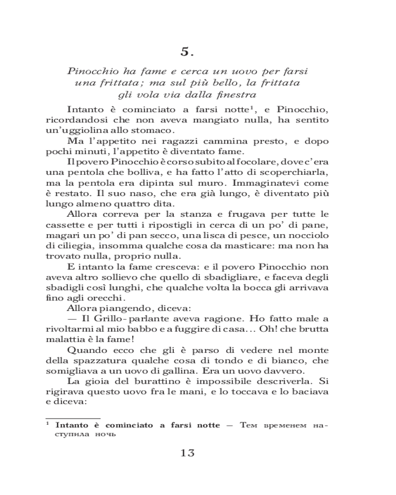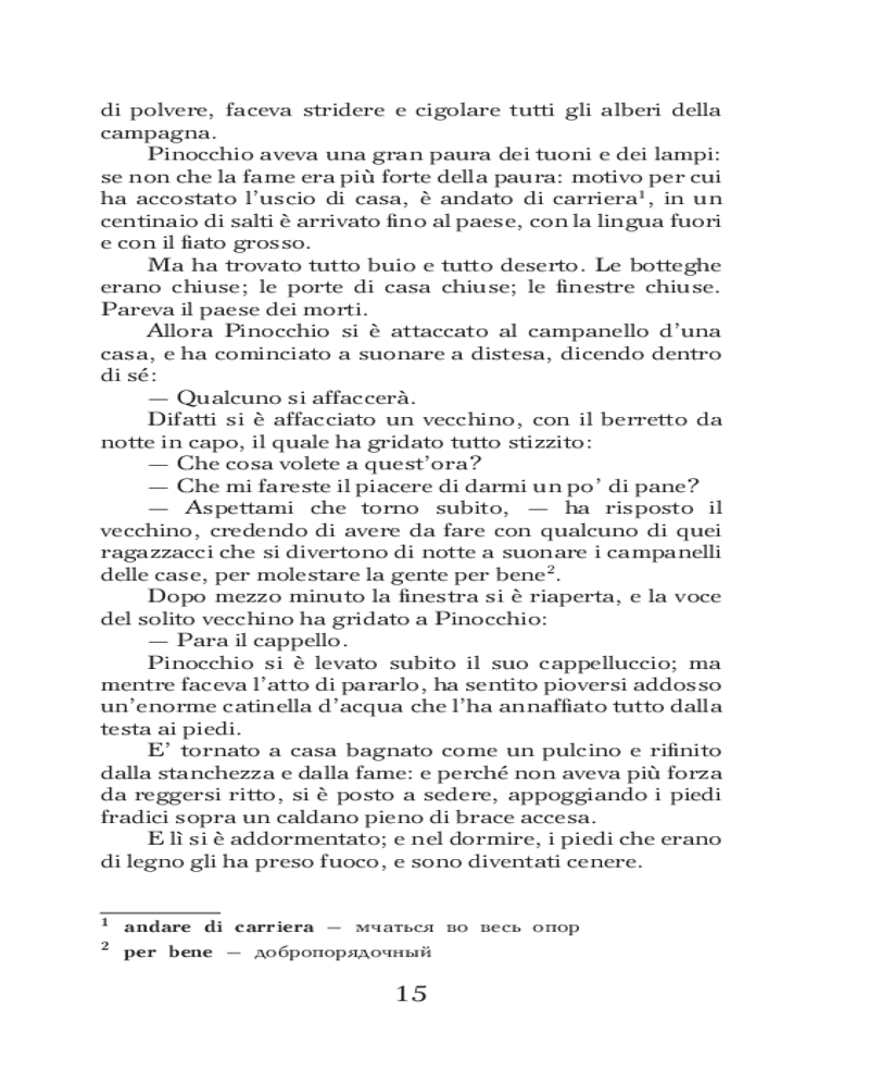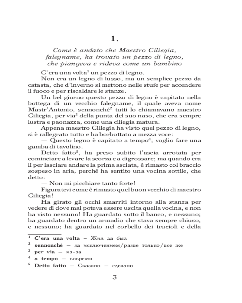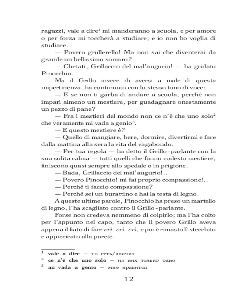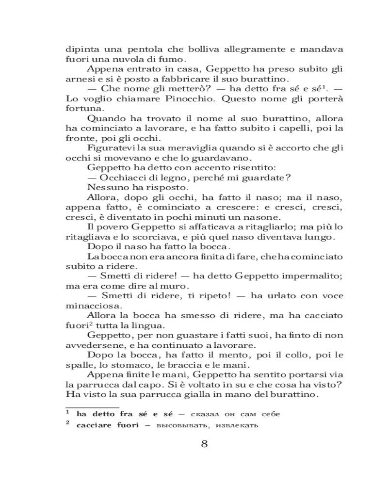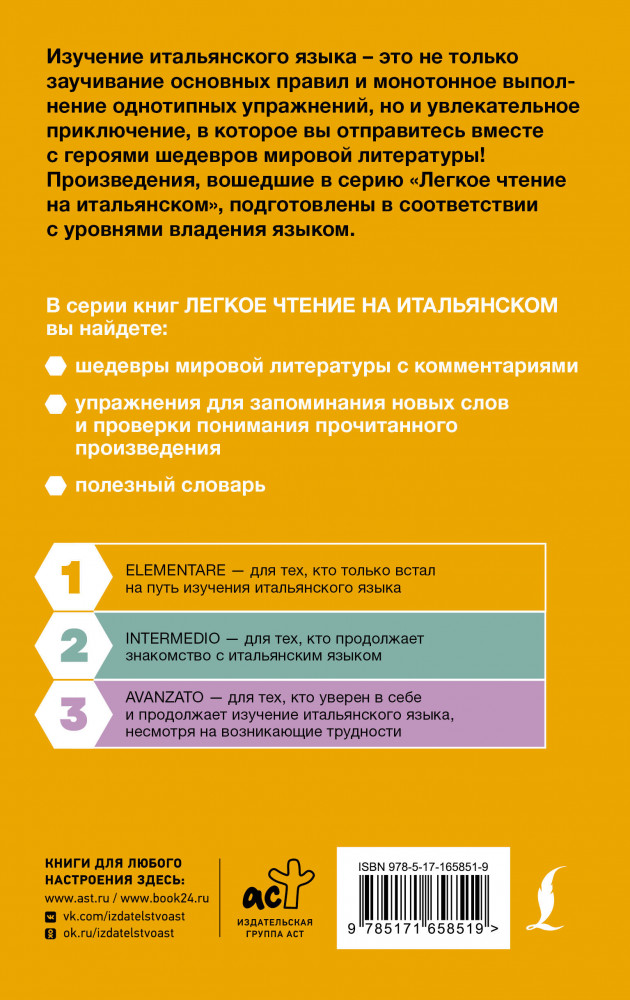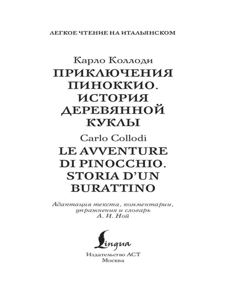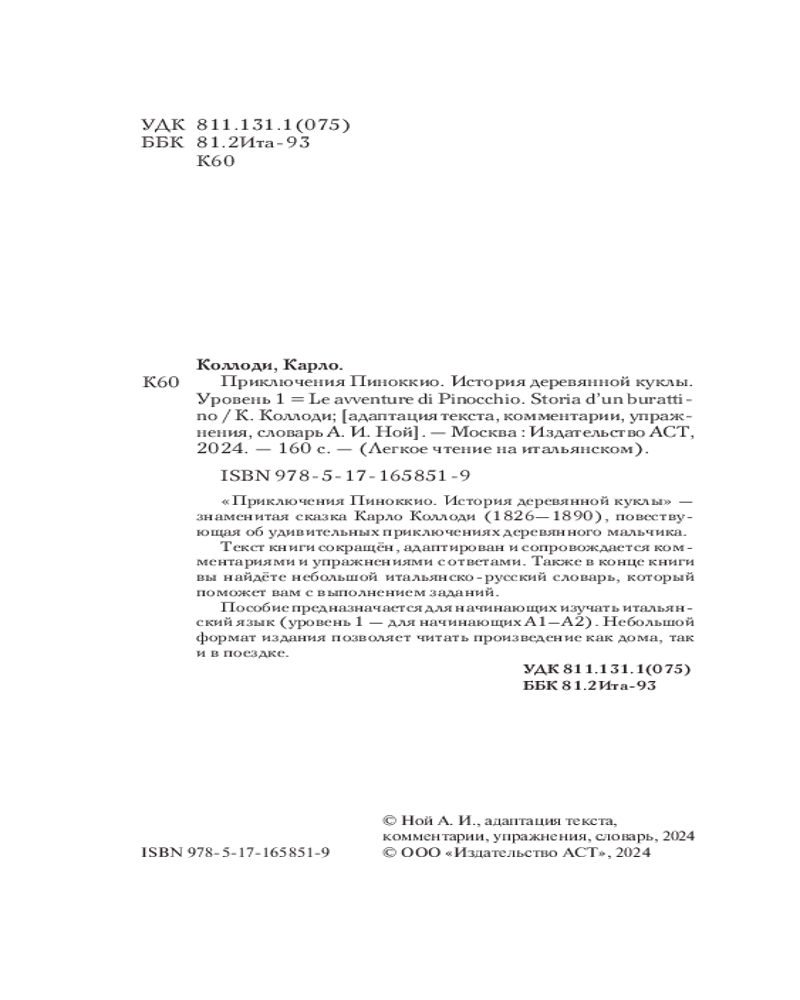 💳 Оплатить за товар можно при получении 🇰🇿 Есть бесплатная доставка по Казахстану от 1 дня 🎁 Копите бонусы с каждой покупки Серия: Легкое чтение на итальянском «Приключения Пиноккио. История деревянной куклы» — знаменитая сказка Карло Коллоди (1826–1890), повествующая об удивительных приключениях деревянного мальчика. Текст книги сокращён, адаптирован и сопровождается комментариями и упражнениями с ответами. Также в конце книги вы найдёте небольшой итальянско-русский словарь, который поможет вам с выполнением заданий. Пособие предназначается для начинающих изучать итальянский язык (уровень 1 — для начинающих А1—А2). Небольшой формат издания позволяет читать произведение как дома, так и в поездке. |