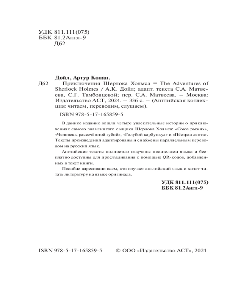 💳 Оплатить за товар можно при получении 🇰🇿 Есть бесплатная доставка по Казахстану от 1 дня 🎁 Копите бонусы с каждой покупки Серия: Английская коллекция: читаем, переводим, слушаем В данное издание вошли четыре увлекательные истории о приключениях самого знаменитого сыщика Шерлока Холмса: «Союз рыжих», «Человек с рассечённой губой», «Голубой карбункул» и «Пёстрая лента». Тексты произведений адаптированы и снабжены параллельным переводом на русский язык. Английские тексты полностью озвучены носителями языка и бесплатно доступны для прослушивания с помощью QR-кодов, добавленных в текст книги. Пособие адресовано всем, кто изучает английский язык и хочет читать литературу на языке оригинала. |