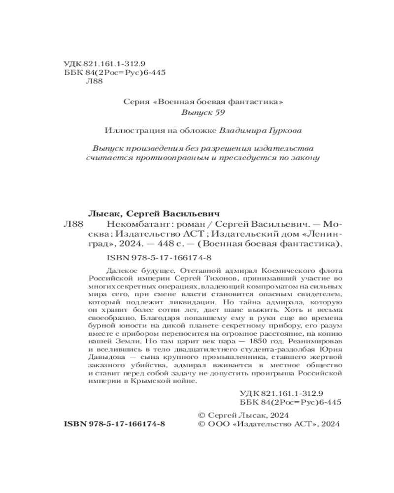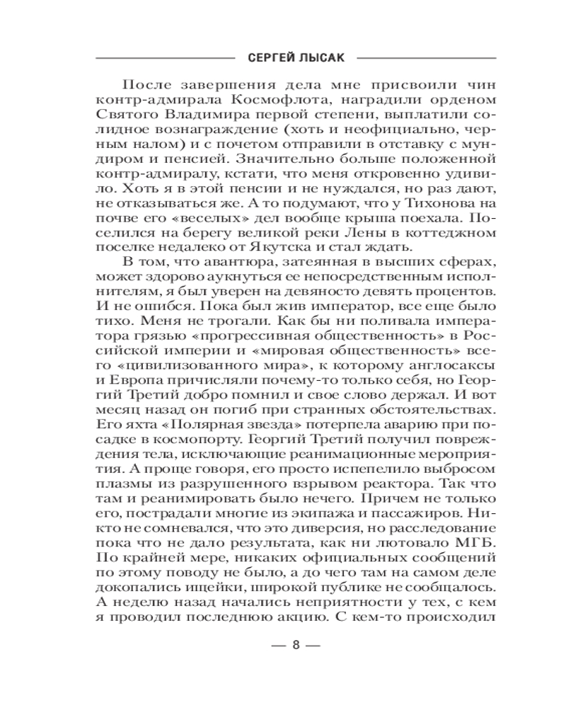 💳 Оплатить за товар можно при получении 🇰🇿 Есть бесплатная доставка по Казахстану от 1 дня 🎁 Копите бонусы с каждой покупки Серия: Военная боевая фантастика Далекое будущее. Отставной адмирал Космического флота Российской империи Сергей Тихонов, принимавший участие во многих секретных операциях, владеющий компроматом на сильных мира сего, при смене власти становится опасным свидетелем, который подлежит ликвидации. Но тайна адмирала, которую он хранит более сотни лет, дает шанс выжить. Хоть и весьма своеобразно. Благодаря попавшему ему в руки еще во времена бурной юности на дикой планете секретному прибору, его разум вместе с прибором переносится на огромное расстояние, на копию нашей Земли. Но там царит век пара — 1850 год. |