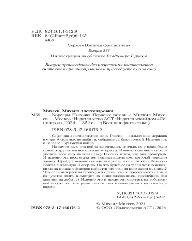 💳 Оплатить за товар можно при получении 🇰🇿 Есть бесплатная доставка по Казахстану от 1 дня 🎁 Копите бонусы с каждой покупки Серия: Военная фантастика Середина девятнадцатого века. Россия — сильнейшая держава в мире. А сильных не любят и, собравшись, бьют толпой. Именно так и началась Крымская война. На самом деле, эта война закончилась вничью, но у врага было самое разрушительное оружие — пресса. Именно газетчики смогли убедить весь мир, включая саму Россию, в том, что она проиграла. И именно эта вера стала тем первым камушком, который породил лавину. Пройдет меньше семидесяти лет — и она погребет Великую Континентальную Империю. Но что будет, если среди честно исполняющих приказ офицеров найдется кто-то, для кого закон не писан? |