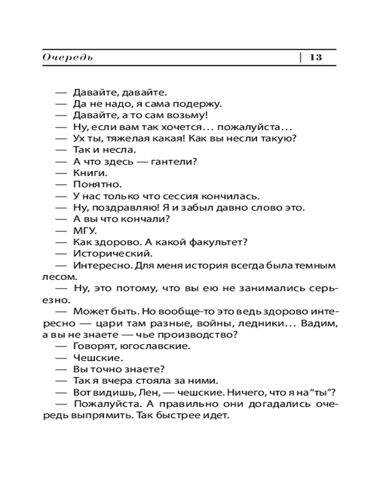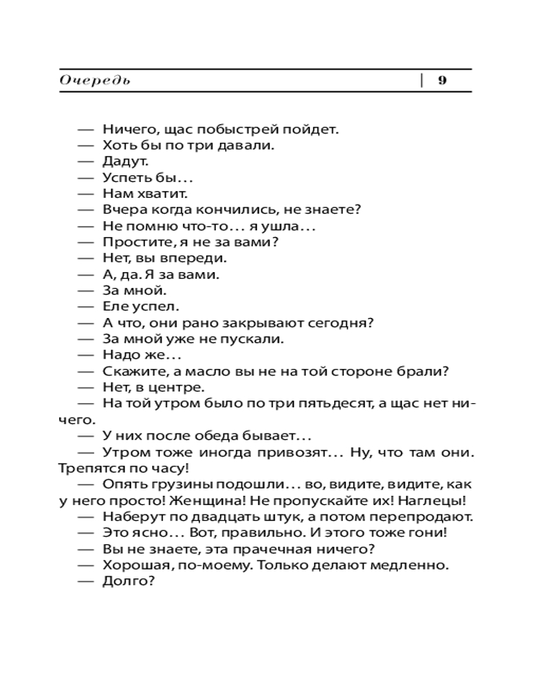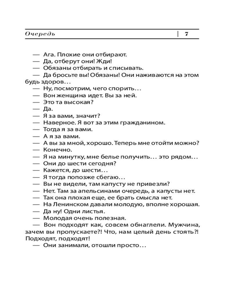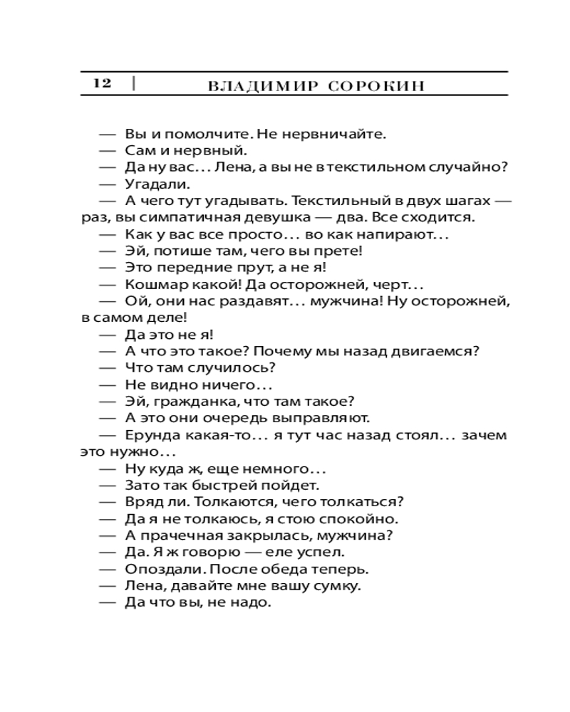 💳 Оплатить за товар можно при получении 🇰🇿 Есть бесплатная доставка по Казахстану 🎁 Копите бонусы с каждой покупки Серия: Эксклюзивная новая классика «Очередь» — первая опубликованная книга Владимира Сорокина — увидела свет в 1985 году в Париже в издательстве «Синтаксис». В ней, как и в ранних рассказах автора, отчетливо видны черты грядущего эксперимента над русской прозой, в ходе которого традиционные жанры, сюжеты и персонажи подвергнутся радикальной трансформации. В романе, полностью состоящем из прямой речи, очередь — метафора человеческой жизни вообще. Деликатно, не докучая назиданиями — напротив, развлекая приключениями героев, — «Очередь» учит, что для достижения цели почти всегда нужны иные усилия, чем те, что мы прикладываем, да и цель мы никогда не видим ясно. Бесконечный разговор едва знакомых между собой людей неслучайно назван романом: каждая реплика, как в большом прозаическом нарративе, добавляет штрих к портрету эпохи и в то же время повисает в воздухе, принадлежит всем — и никому. |