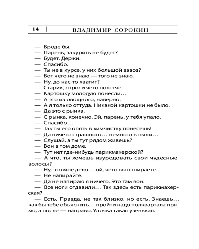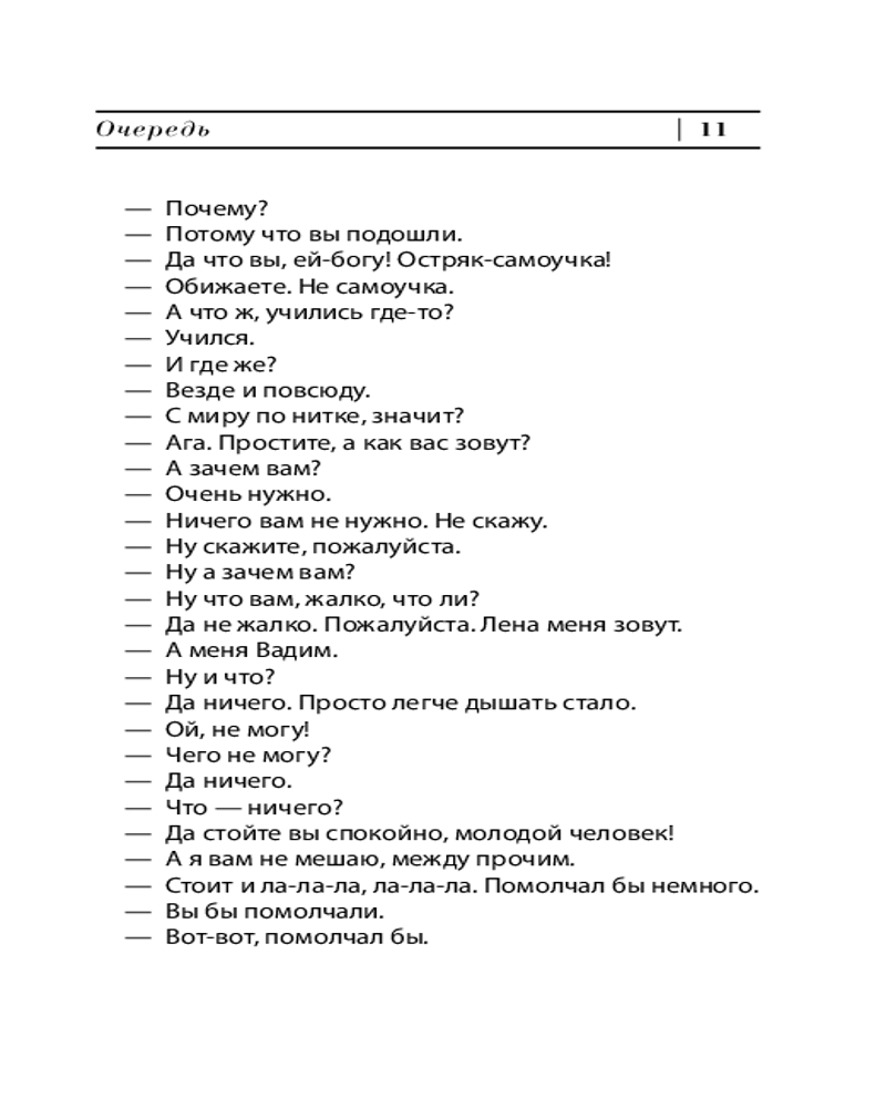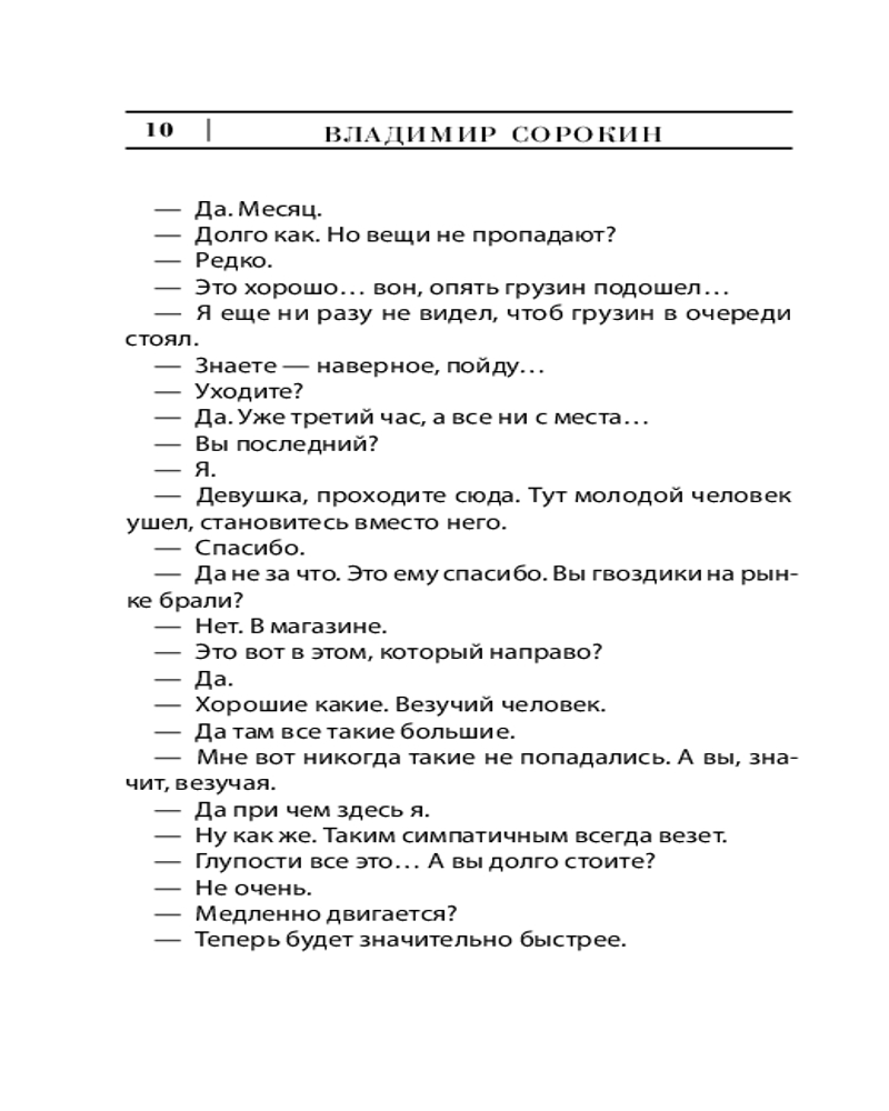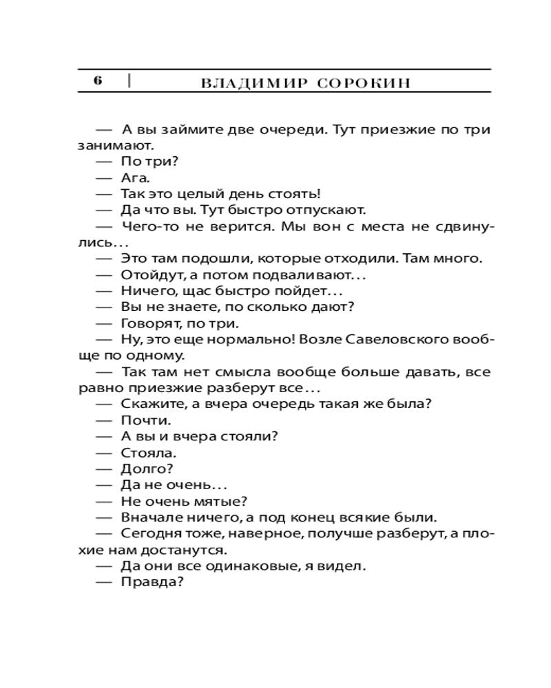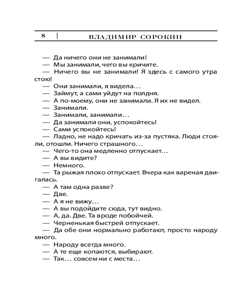 💳 Оплатить за товар можно при получении 🇰🇿 Есть бесплатная доставка по Казахстану 🎁 Копите бонусы с каждой покупки Серия: Эксклюзивная новая классика «Очередь» — первая опубликованная книга Владимира Сорокина — увидела свет в 1985 году в Париже в издательстве «Синтаксис». В ней, как и в ранних рассказах автора, отчетливо видны черты грядущего эксперимента над русской прозой, в ходе которого традиционные жанры, сюжеты и персонажи подвергнутся радикальной трансформации. В романе, полностью состоящем из прямой речи, очередь — метафора человеческой жизни вообще. Деликатно, не докучая назиданиями — напротив, развлекая приключениями героев, — «Очередь» учит, что для достижения цели почти всегда нужны иные усилия, чем те, что мы прикладываем, да и цель мы никогда не видим ясно. Бесконечный разговор едва знакомых между собой людей неслучайно назван романом: каждая реплика, как в большом прозаическом нарративе, добавляет штрих к портрету эпохи и в то же время повисает в воздухе, принадлежит всем — и никому. |