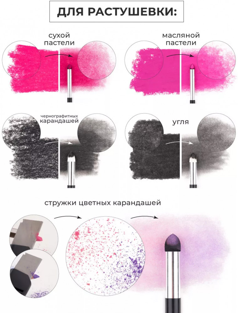 💳 Оплатить за товар можно при получении 🇰🇿 Есть бесплатная доставка по Казахстану от 1 дня 🎁 Копите бонусы с каждой покупки Двухсторонние растушевки для работы с пастелью и карандашами. Одной стороны они мягкие, с другой плотные для того, чтобы создавать разные эффекты и творить на бумаге с разной степенью гладкости. В наборе 2 двусторонние растушевки, которые подойдут как для больших поверхностей, так и для проработки отдельных небольших участков. |