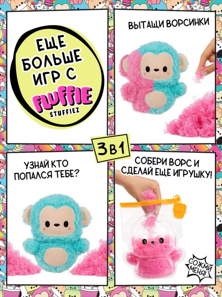 Познакомься с новым очаровательным персонажем — это Обезьяна по имени Гуава! Выщипай верхний слой ворса и узнай, какой цвет прячется внутри. Смотри, Обезьяна Гуава теперь голубого цвета! |