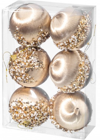 Набор из 6 новогодних шаров украсит вашу елочку и создаст праздничную атмосферу для взрослых и детей! Выполнены из полиуретана. Изделия из этого материала славятся своей лёгкостью. Диаметр каждого шара — 10 см. Шарики в оттенке шампань украшены декором, напоминающим жемчужины. Игрушки подойдут для использования в роли елочного украшения или интерьерного декора. Лёгкие шары можно использовать для создания декоративных композиций и повесить на дверь, окно и живые ёлки во дворе. Каждый шарик имеет удобную петлю для подвешивания на веточку ёлки или стену. |