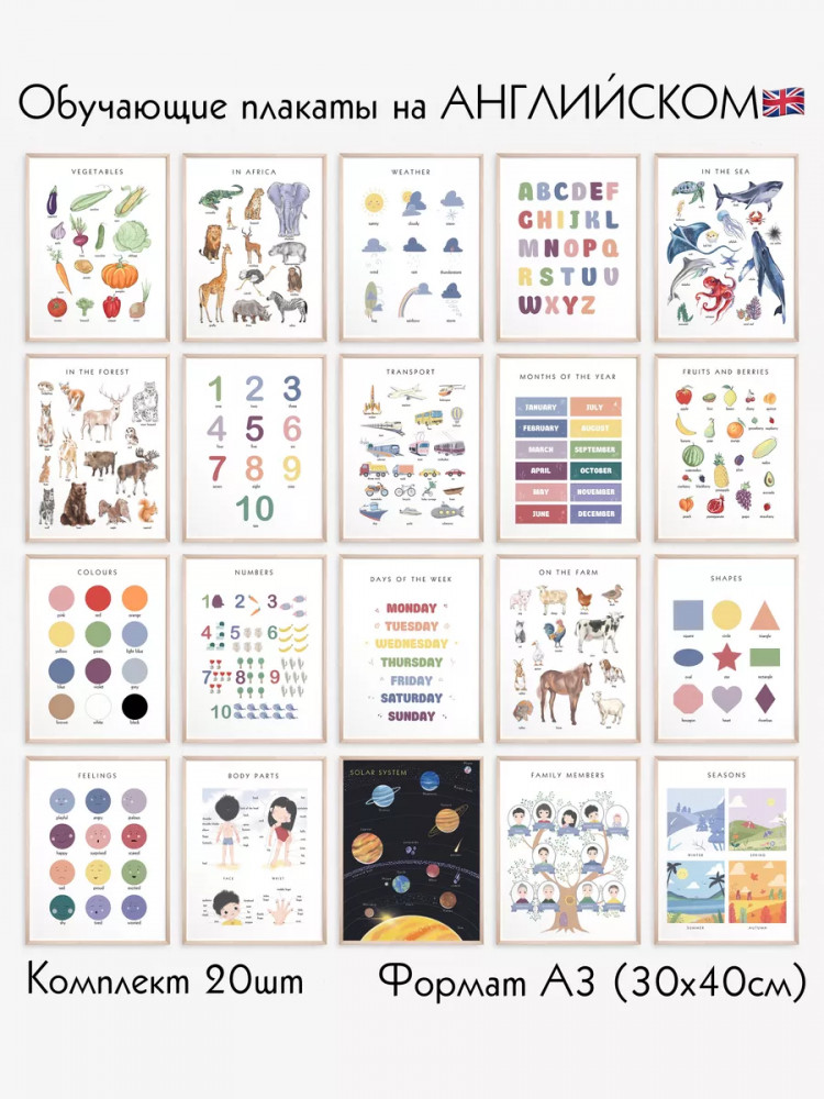 💳 Оплатить за товар можно при получении 🇰🇿 Есть бесплатная доставка по Казахстану от 1 дня 🎁 Копите бонусы с каждой покупки Обучающие постеры на английском языке для детей формат А3 без ламинирования. Постеры для детей набор 20 штук. Обучающие плакаты для детей, отлично подойдут для раннего развития и помогут познакомить ребенка с такими базовыми понятиями на английском языке, как цвета, фигуры, фрукты и ягоды, овощи, животные на ферме, в Африке, в лесу, погода, чувства, счет, времена года, морские животные, части тела, члены семьи, алфавит, цифры, дни недели, месяцы, Солнечная система и транспорт. |