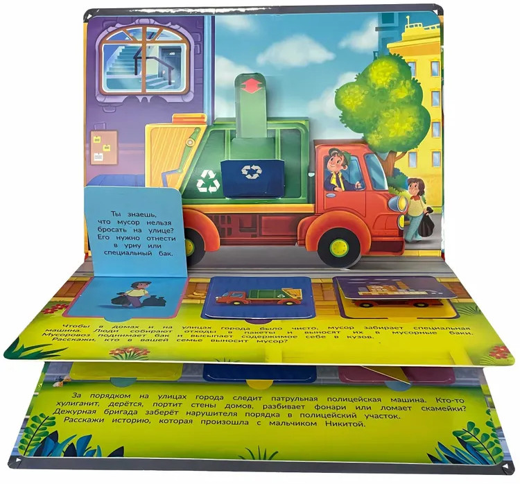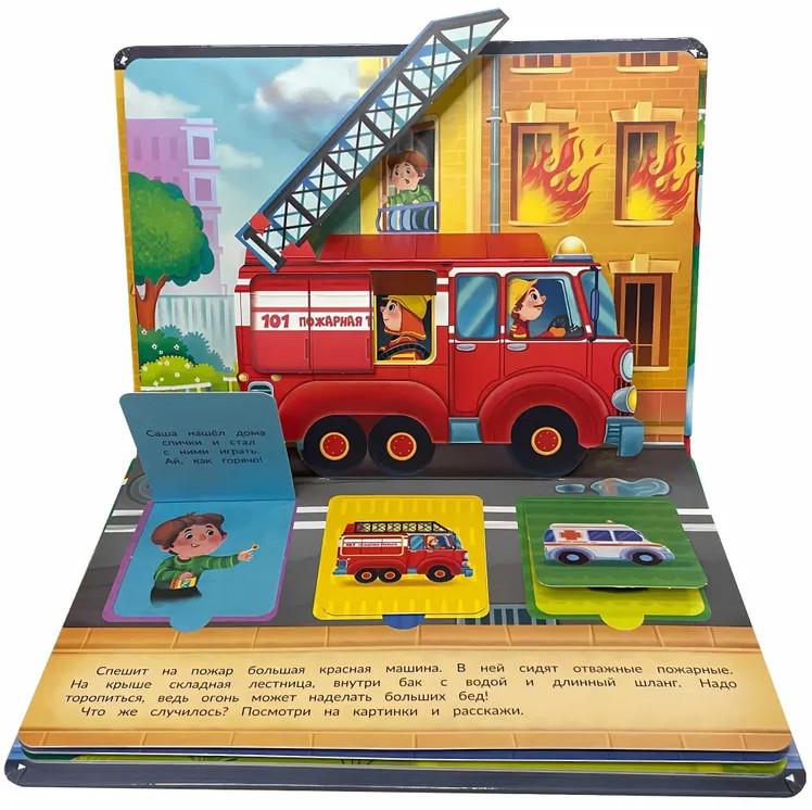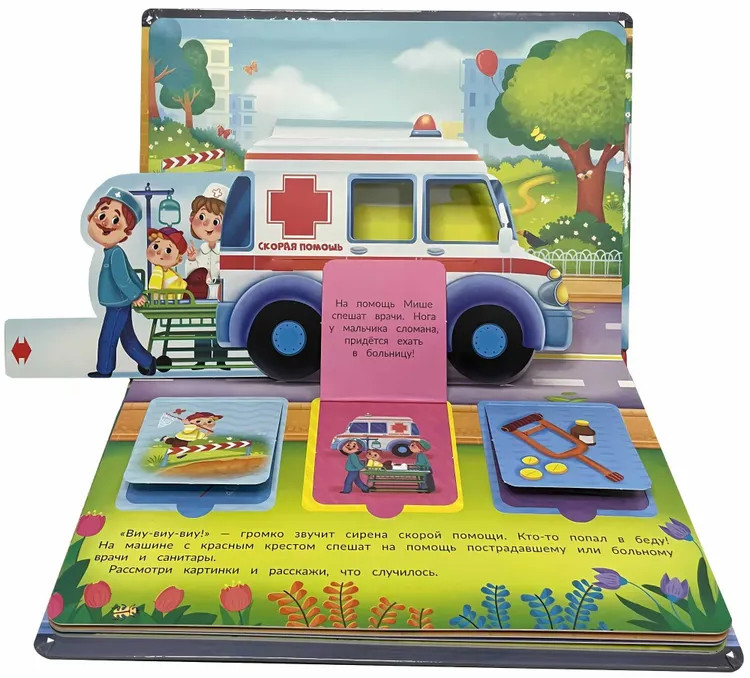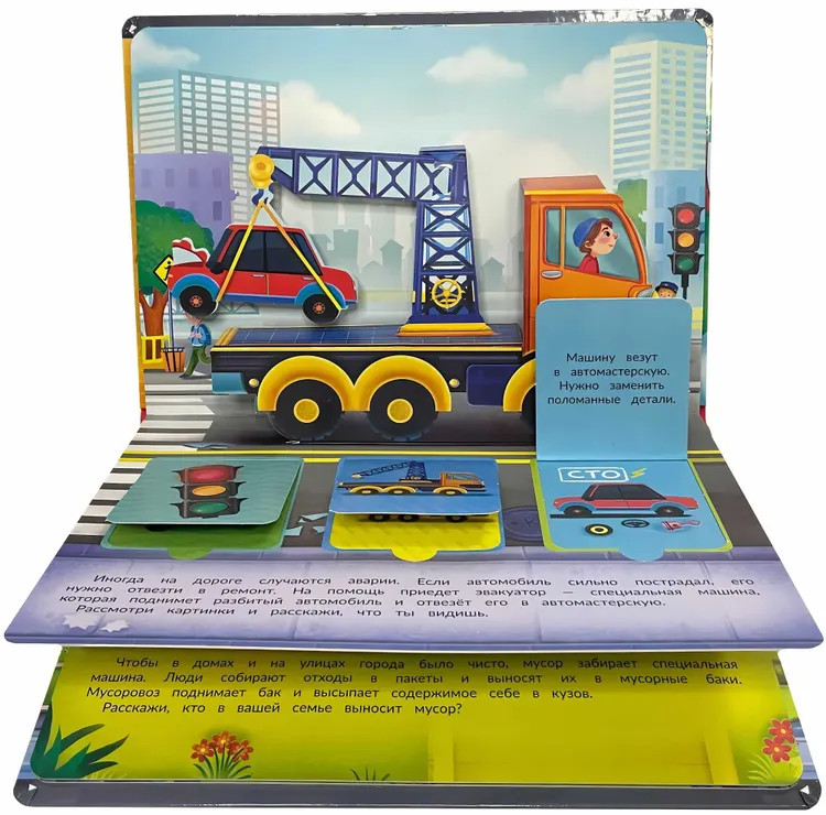 Каждую минуту на улицах города что-то происходит, и на помощь спешат важные и нужные машины. Это удивительная книга! На каждом развороте есть объемные машины с подвижными деталями и окошки. А значит книгу можно не только читать, с ней можно играть. Издание подойдет для занятий и игр с детьми в возрасте от двух лет. Развивает пространственное мышление, логику, мелкую моторику, зрительное восприятие, дает первые знания о полезных и очень любимых всеми мальчишками машинах. Книга большого формата, изготовлена из целлюлозного картона, на обложке глянцевая ламинация, а все страницы покрыты защитным безопасным лаком. На пяти разворотах 15 окошек с познавательной информацией и пять больших объемных картинок с подвижными элементами. |