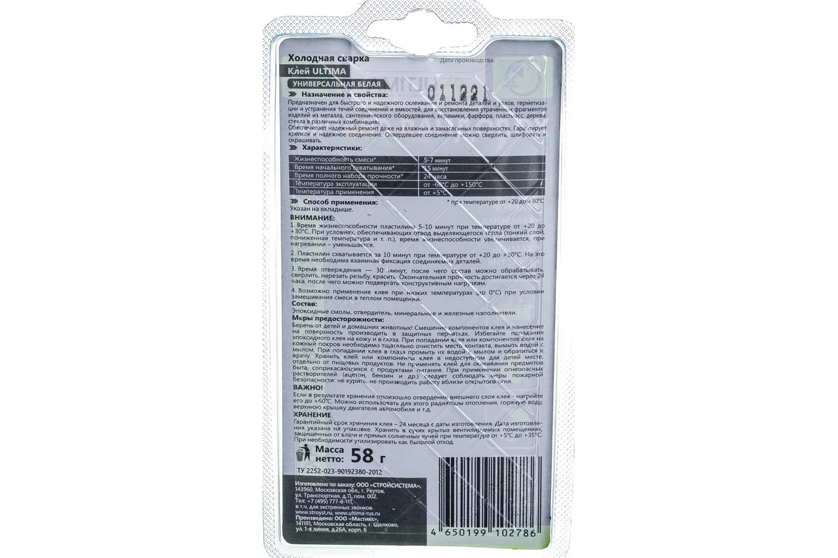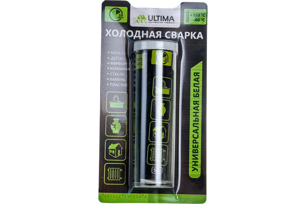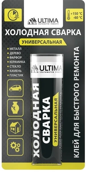 Универсальный клей холодная сварка Ultima Экспресс белый, 58 г UA5825 предназначен для быстрого и надежного склеивания, ремонта деталей и узлов, герметизации соединений и емкостей, для восстановления утраченных фрагментов изделий из керамики и фарфора, а также из цветных и черных металлов, пластмасс, дерева в различных комбинациях. Температура эксплуатации отремонтированных изделий от -60 до +150 градусов. Обеспечивает надежный ремонт на влажных и замасленных поверхностях, при низких (до -10 градусов) температурах (при условии замешивания смеси в теплом помещении).