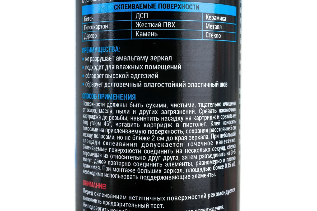 Предназначен для приклеивания зеркал, мозаики и зеркальной плитке к поверхностям из: