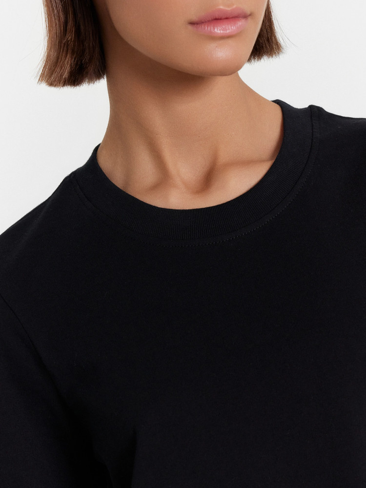 Хорошая футболка приятная к телу. Не тонкая, плотная. Размер соответствует. Длина футболки выше линии бедра.