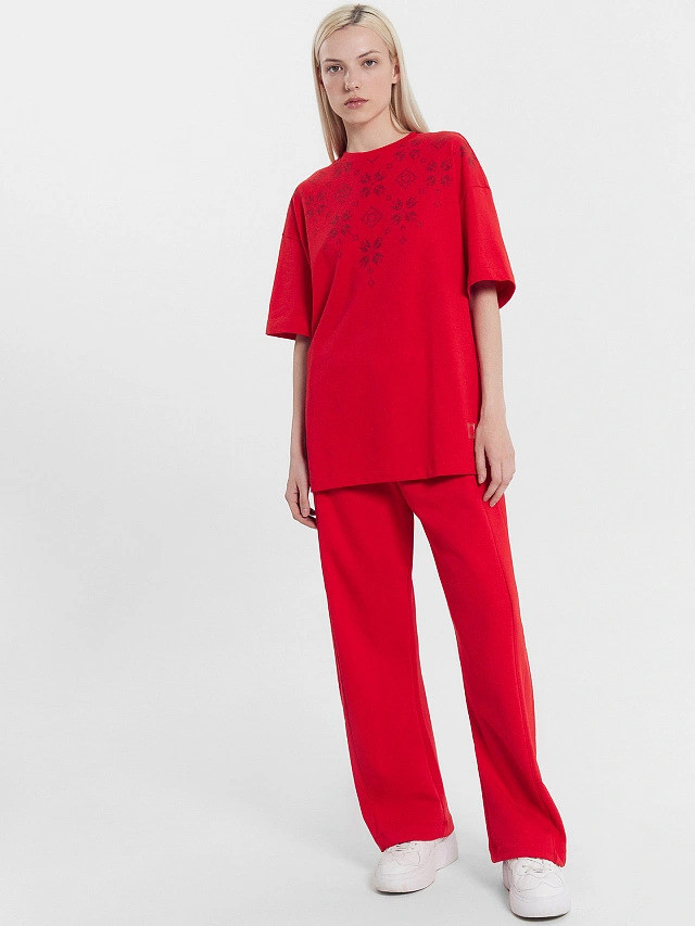 Плотный хороший материал, яркие. Длинные - носить с кроссовками-ботинками на высокой подошве (мой рост 167 см.) На свой размер М-L я взяла XS (других размеров уже не оставалось), как не странно, но подошли по размеру. У меня из этой же серии красная футболка есть - так что ношу как костюмчик - очень классно сидят вещи вместе.