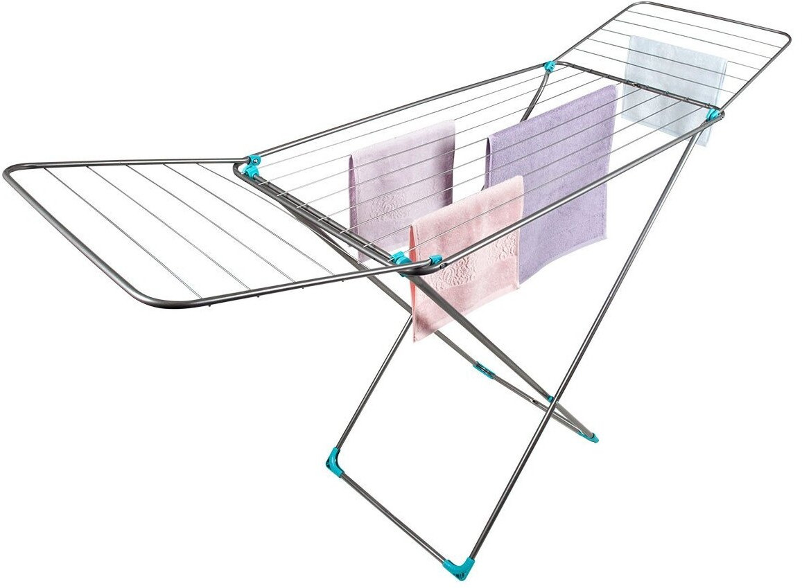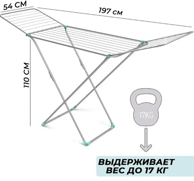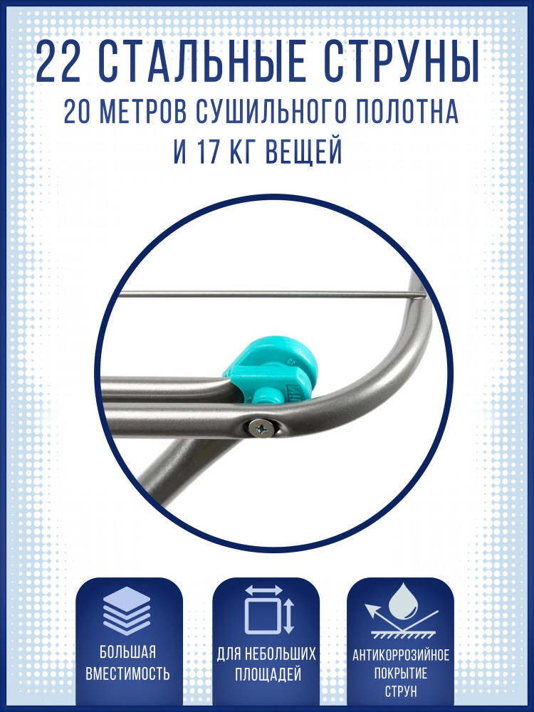 Напольная сушилка для белья, станет незаменимым помощником в Вашем доме. Изделие изготовлено из высококачественной стали, которая обладает антикоррозийными свойствами и влагоустойчивостью. 22 прута общей длиной 20 метров подходят для развешивания количества белья, равного трем циклам стиральной машины. Сушилка оснащена 2 откидными крыльями для сушки, которые компактно складываются после использования. В сложенном виде толщина изделия не превышает 4 см. Резиновые фиксаторы опоры предотвращают скольжение и появление царапин на полу, а также делают сушилку устойчивой даже при неравномерной нагрузке. Контроль сварки и антикоррозийная обработка материалов обеспечивает долгий срок службы изделия.