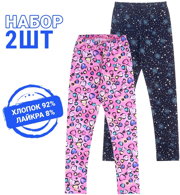 Комплект из двух пар облегающих легинсов для девочек, выполненных из кулира — легкого хлопкового полотна с лайкрой. Изделия на комфортном эластичном поясе.