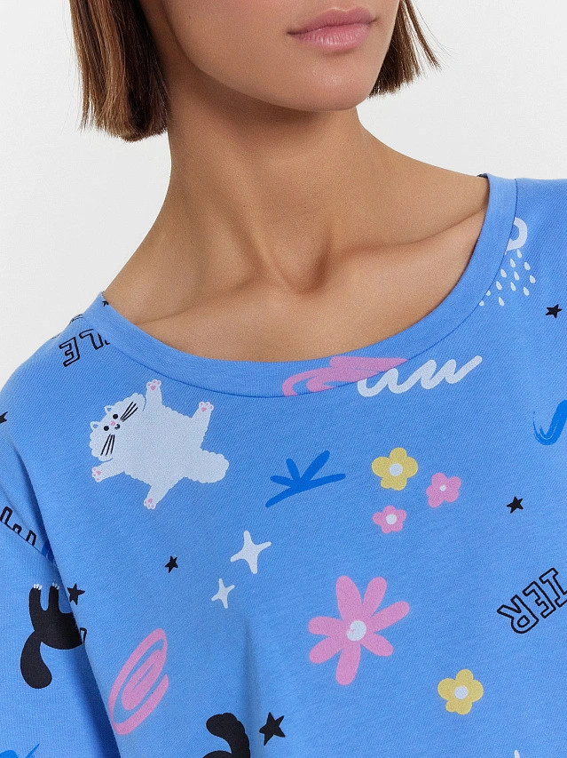 брала для дочки подростка, по размеру подошла. вырез только широковат, но не принципиально. ткань хлопок, после стирки имеет первоначальный вид