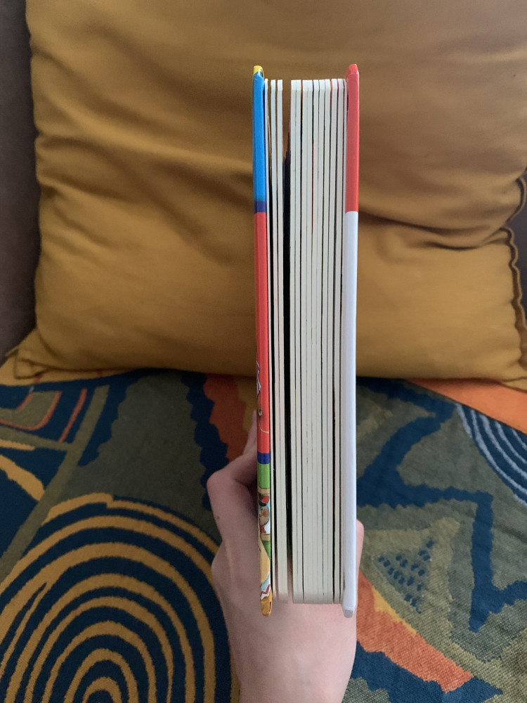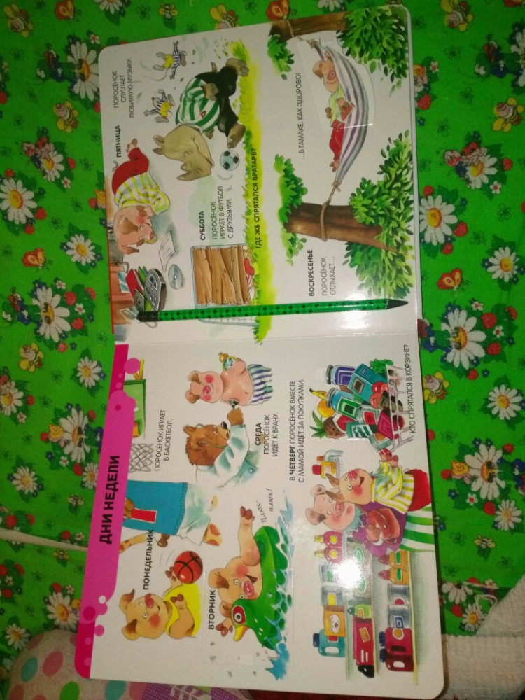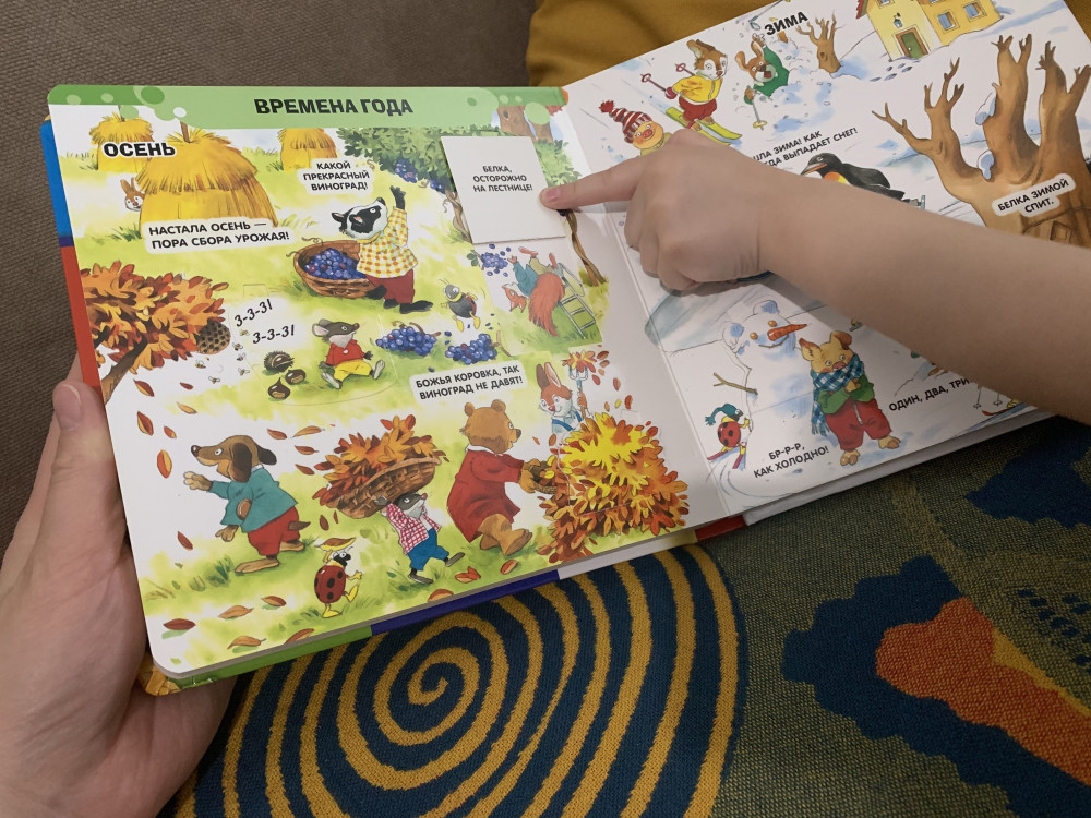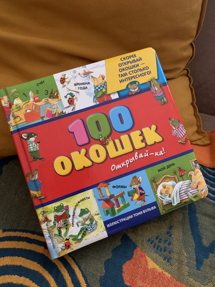 Интересно было первый раз открывать окошки. Сейчас пока лежит на полке с редко читаемыми книжками. Но идея с окошками хорошая. Можно изучать цифры, времена года, дни недели