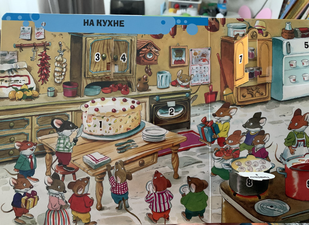 Это не просто прорези-окошки. Все очень органично и по темам подобрано. Например, в теме "счет на кухне" можно во все шкафчики залезть и даже в холодильник. Великолепно!