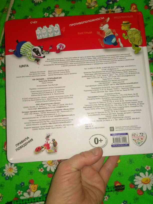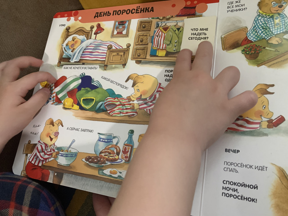 Качество книги очень хорошее. Содержание лично мне не нравится. Иллюстрации тоже. Думала привыкну, нет, терпеть не могу эту книгу. Читать с ребенком там особо нечего, объяснять тоже. Пару страниц более-менее, где цвета и счёт. Интересно только окошки открывать, но лучше бы я другую с окошками поискала.
