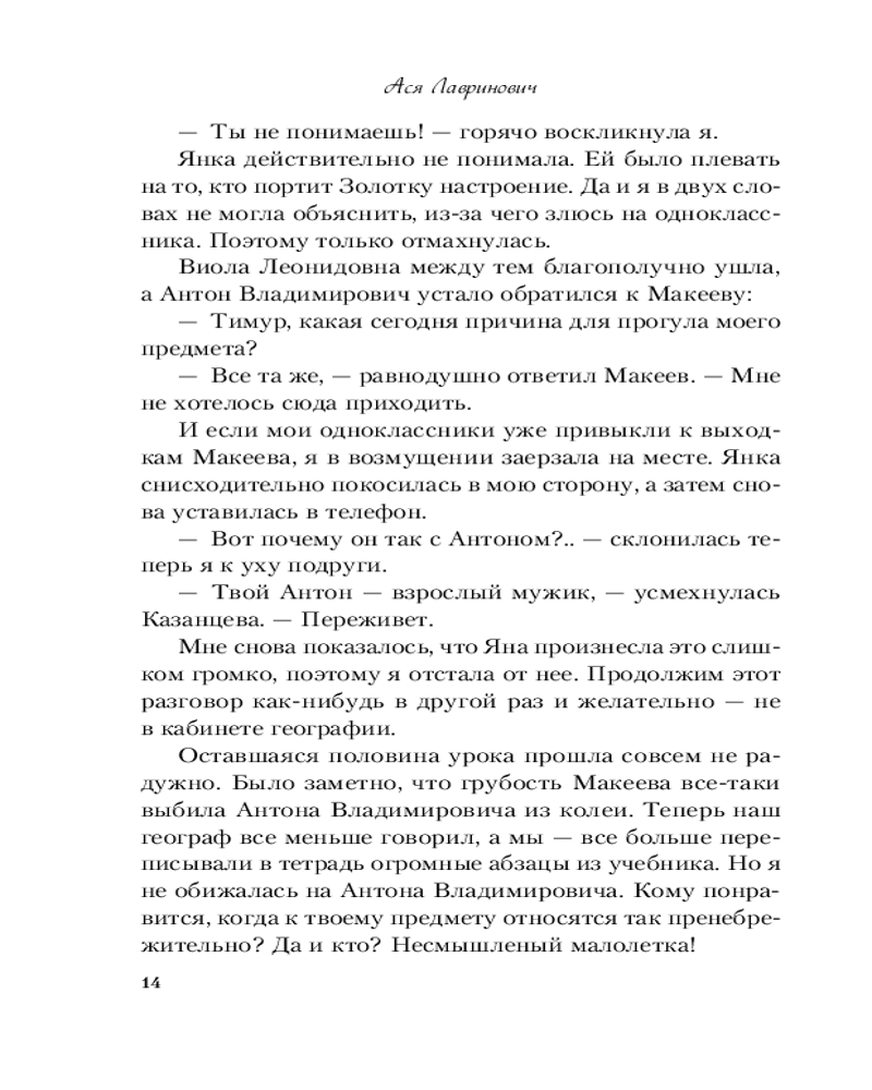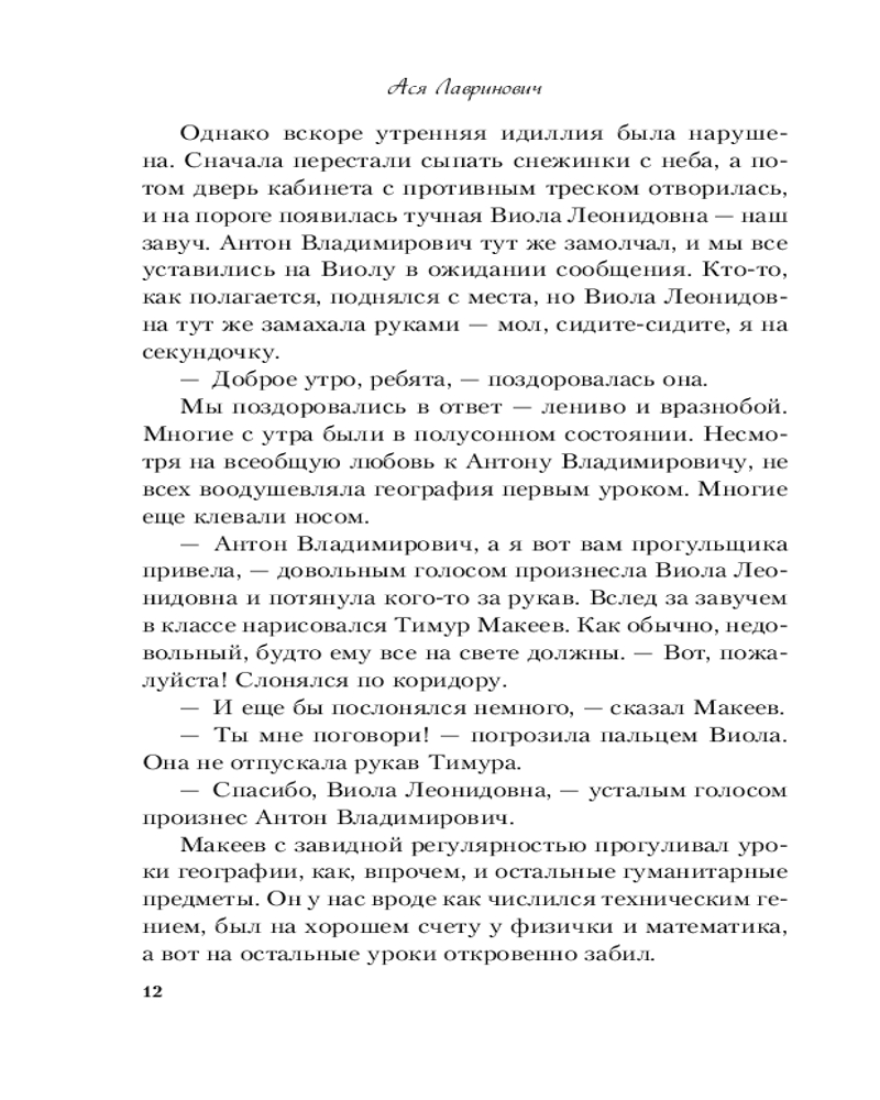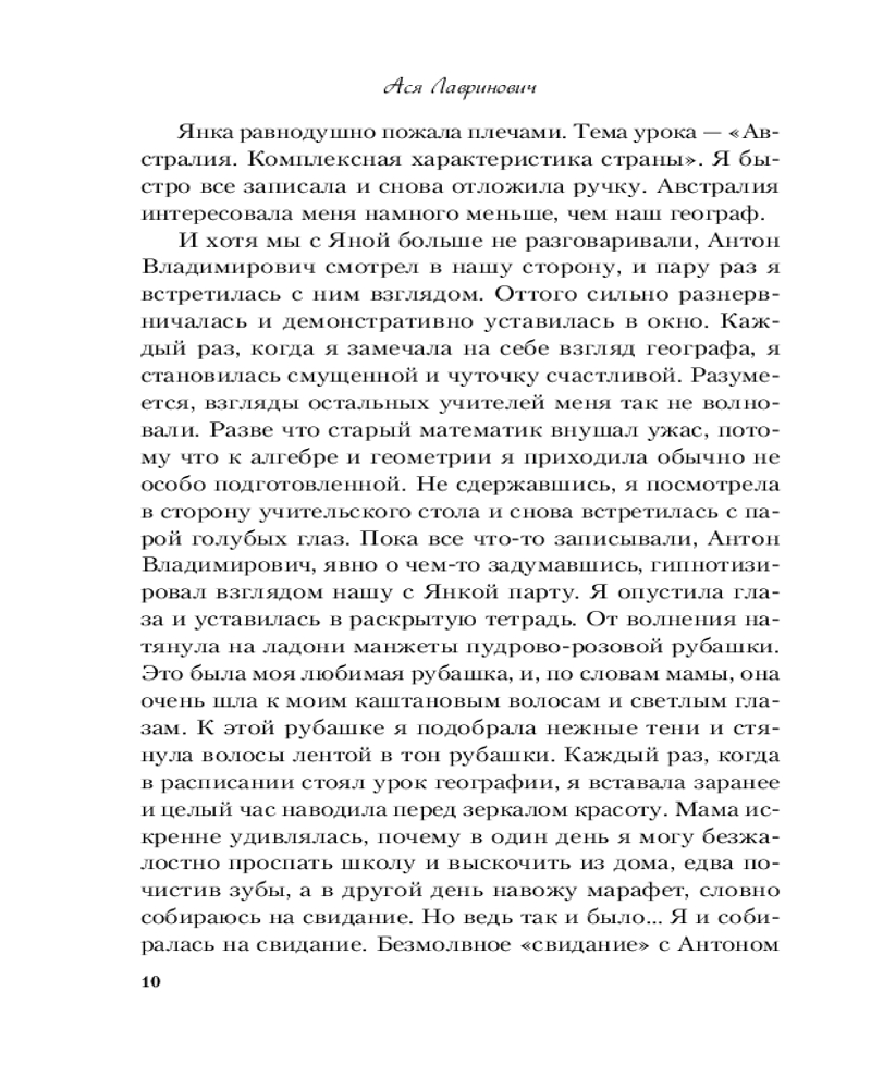 Ася Лавринович — молодой талантливый автор из Санкт-Петербурга. Училась на юридическом факультете, но бросила его и поступила на журфак. Работала по специальности в крупном издательском доме, освещала новости спорта. Сейчас Ася работает фрилансером и пишет милые любовные романы для девушек, которые выкладывает на сайтах Wattpad и Litnet. |