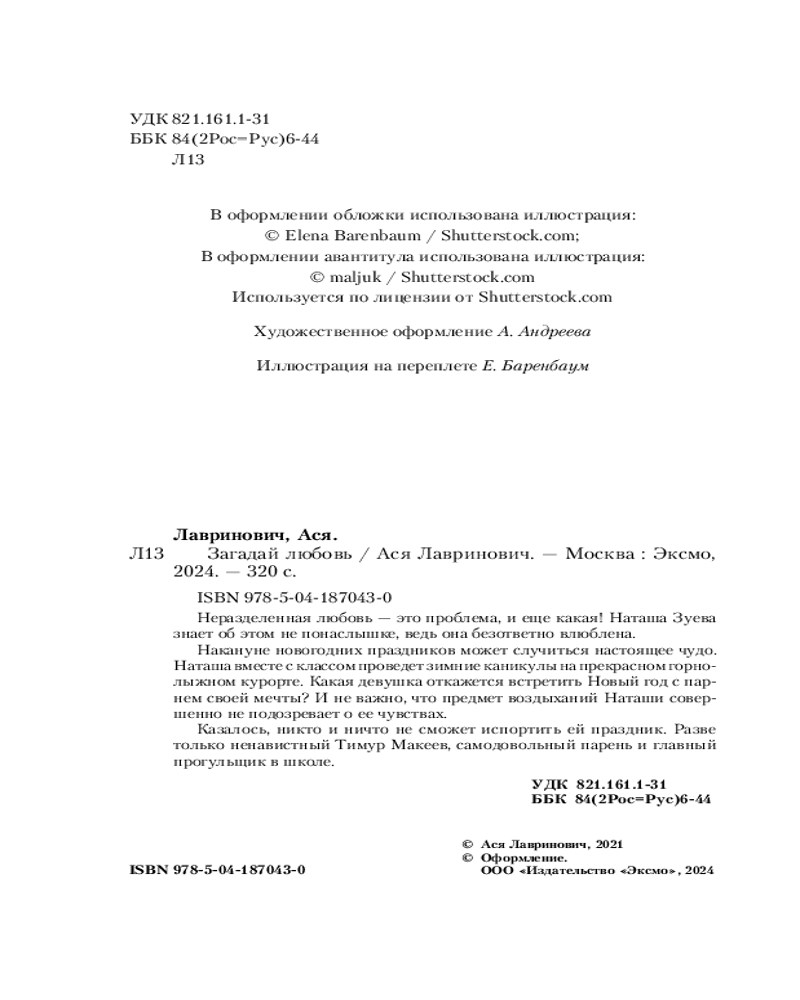 Ася Лавринович — один из самых популярных авторов российского янг эдалта в жанре современной сентиментальной прозы. Суммарный тираж ее проданных книг составляет более 1 млн экземпляров. Победитель премии «Выбор читателей 2023» на Livelib в номинации «Young adult. Лучшая книга о подростках и для подростков». На две книги Аси — «Загадай любовь» и «Нелюбовь сероглазого короля» — куплены права на экранизацию. |