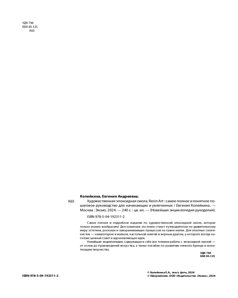 💳 Оплатить за товар можно при получении 🇰🇿 Есть бесплатная доставка по Казахстану от 1 дня 🎁 Копите бонусы с каждой покупки Серия: Новейшая энциклопедия рукоделия «Настоящая библия для влюбленных в эпоксидку! Всю эту информацию можно собирать бесконечно, но так и не разгадать тайны мастера... Но для меня главное, что здесь живет вдохновение». — Лана Весова, выпускница ArtWorld Janni School, художник-смолянист. Евгения Копейкина (artworld_janni) — основатель бренда ArtWorld Janni и онлайн-школы ArtWorld Janni School, автор множества техник заливки смолой. Преподаватель техники рисования художественной смолой Resin Art, обучившая сотни мастеров по всему миру. Эта книга дарит невероятные возможности для творчества и вдохновения! |