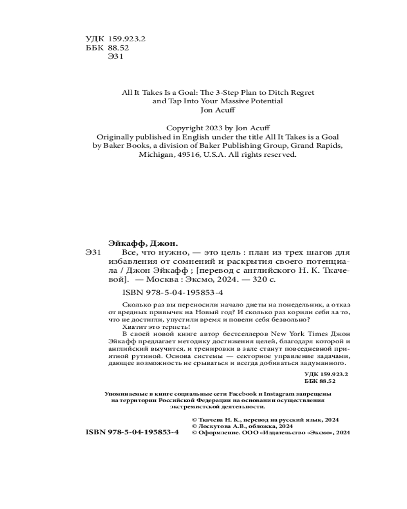 💳 Оплатить за товар можно при получении 🇰🇿 Есть бесплатная доставка по Казахстану от 1 дня 🎁 Копите бонусы с каждой покупки Серия: Психология общения. Новое оформление Сколько раз вы переносили начало диеты на понедельник, а отказ от вредных привычек — на Новый год? И сколько раз корили себя за то, что не достигли, упустили время и повели себя безвольно? Хватит это терпеть! В своей новой книге автор бестселлеров New York Times Джон Эйкафф предлагает методику достижения целей, благодаря которой и английский выучится, и тренировки в зале станут повседневной приятной рутиной. Основа системы — секторное управление задачами, дающее возможность не срываться и всегда добиваться задуманного. |