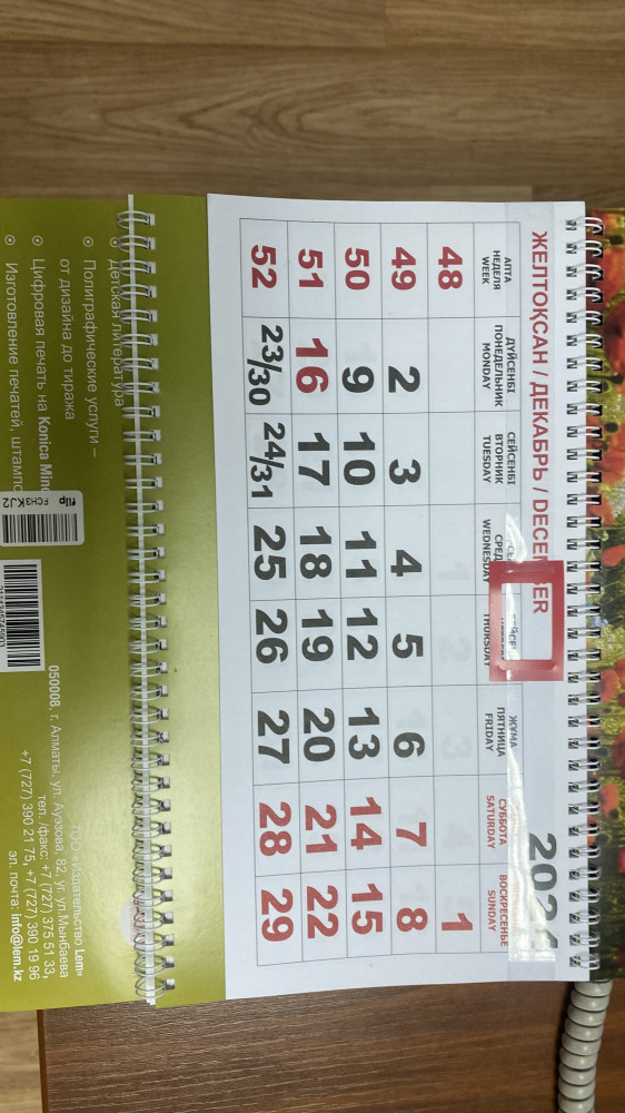💳 Оплатить за товар можно при получении 🇰🇿 Есть бесплатная доставка по Казахстану от 1 дня 🎁 Копите бонусы с каждой покупки Календарь квартальный настенный с праздничными и выходными днями в РК на 2025 год. Из 3-х блоков по 12 страниц на пружине. Размер календаря 30 см на 80 см. Календарь имеет русский, английский, казахский языка. Имеется бегунок. |