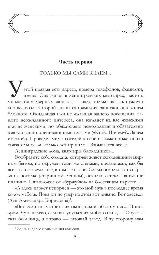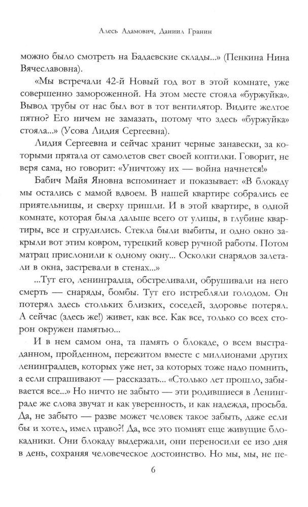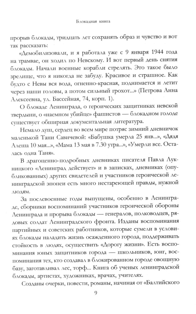 Искала эту книгу - очень хотела прочесть. Читаю со слезами. Я многое знаю о блокадном Ленинграде, я жила в этом городе. Я видела каждый день надпись - Эта сторона улицы при артобстреле наиболее опасна*, она и сейчас на этом месте, и, выходя из института (по улице Герцена) она всегда читается вольно или невольно. Хотела иметь эту книгу еще и потому, что мой дедушка воевал на Дороге Жизни., был ранен и скончался от ран, защищая Ленинград и только в прошлом году, спустя 70 лет нам удалось найти место, где наш дедушка похоронен в Братской могиле. НО живые свидетельства того времени, описанные в книге ошеломляют. Живая память. Была удивлена, но мои дети тоже все с большим интересом прочли книгу. Рекомендую настоятельно всем.