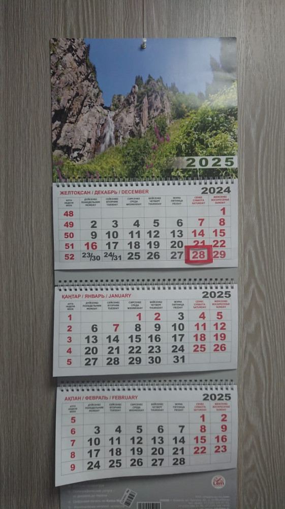 Квартальный настенный календарь РК на 2025 год «Водопад в горах»удобный красивый серия В данный момент этот товар отсутствует в продаже. Возможно, у нас найдется аналогичный или похожий товар здесь. Календарь квартальный настенный с праздничными и выходными днями в РК на 2025 год. Из 3-х блоков по 12 страниц на пружине. Размер календаря 30 см на 80 см. Календарь имеет русский, английский, казахский языка. Имеется бегунок. |
