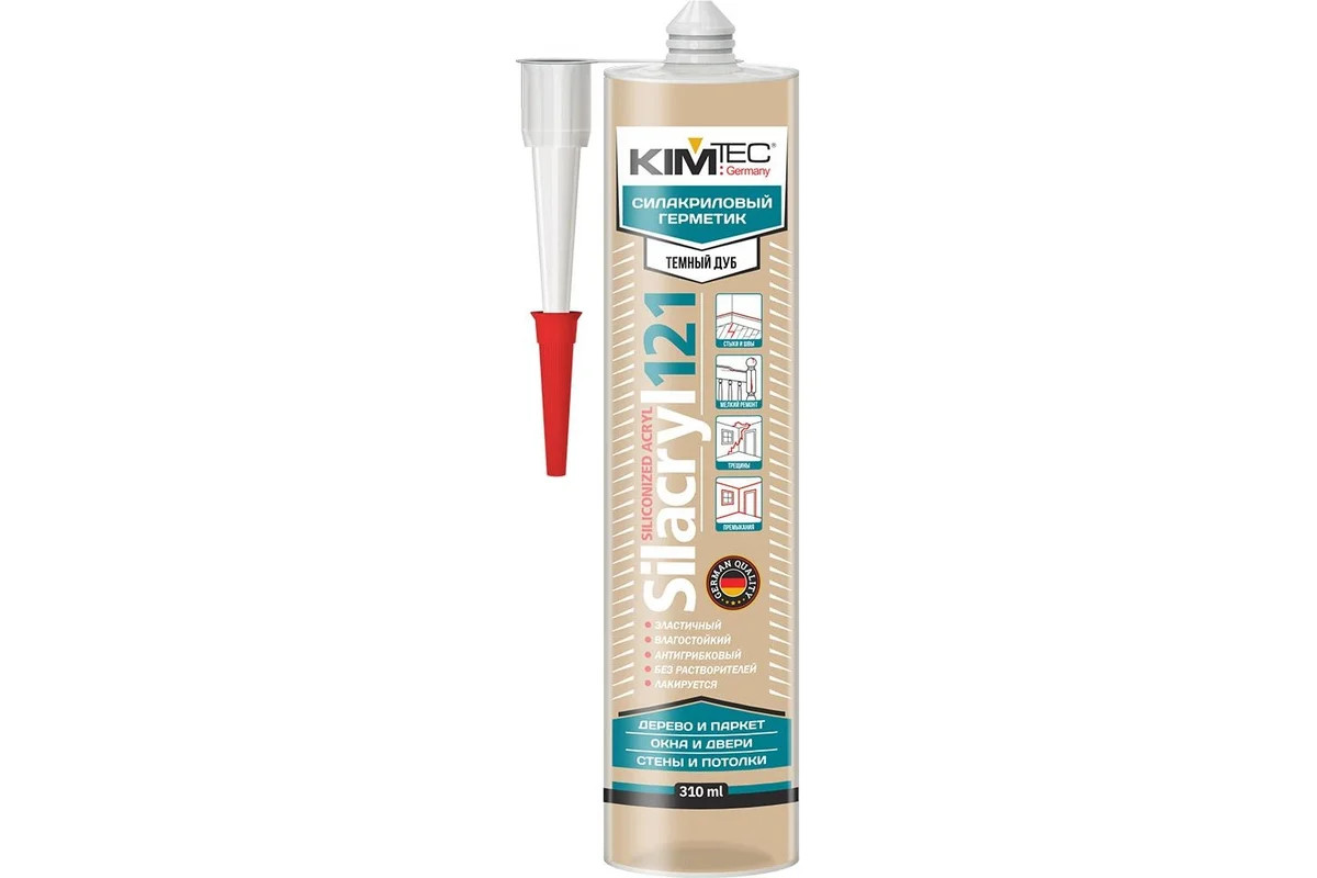 Силакриловый герметик Kim Tec Silacryl 121 темный дуб, 310 мл обладает адгезией к разным материалам без использования грунтовок. Тиксотропные свойства данного уплотнителя позволяют использовать его на вертикальных и потолочных поверхностях. Kim Tec Silacryl 121 особенно пригоден для эластичного уплотнения и склеивания таких материалов, как дерево, кирпичная кладка, металл, керамика, камень, мрамор и многие пластики.
