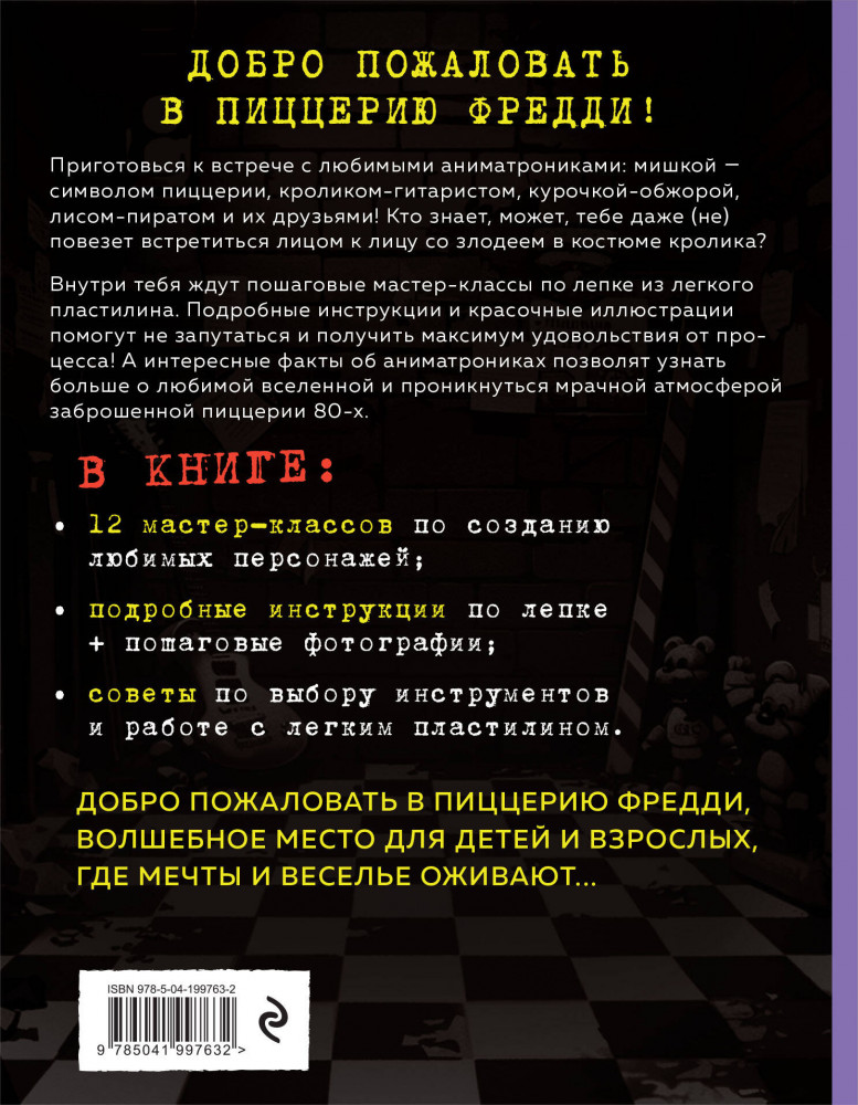 💳 Оплатить за товар можно при получении 🇰🇿 Есть бесплатная доставка по Казахстану от 1 дня 🎁 Копите бонусы с каждой покупки Серия: Мое любимое хобби. Книги для тинейджеров Слепи любимых аниматроников из пластилина! Примерь на себя роль ночного охранника таинственной пиццерии и встреться лицом к лицу с роботами, что бродят по ее коридорам глубокой ночью. На страницах тебя ждут мишка — символ пиццерии, кролик-гитарист, курочка-обжора, лис-пират и их друзья! Кто знает, может, тебе даже (не)повезет встретиться лицом к лицу со злодеем в костюме кролика? Внутри тебя ждут понятные пошаговые мастер-классы по лепке из легкого пластилина. Ты узнаешь все тонкости и секреты работы с этим материалом. Подробные инструкции и красочные иллюстрации помогут не запутаться и получить максимум удовольствия от процесса! А интересные факты об аниматрониках, которые ты найдешь на страницах, позволят узнать больше о любимой вселенной и проникнуться мрачной атмосферой заброшенной пиццерии 80-х. Добро пожаловать в Пиццерию Фредди, волшебное место для детей и взрослых, где мечты и веселье оживают... |