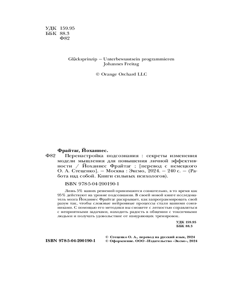 💳 Оплатить за товар можно при получении 🇰🇿 Есть бесплатная доставка по Казахстану от 1 дня 🎁 Копите бонусы с каждой покупки Серия: Работа над собой. Книги сильных психологов Только 5% ваших решений контролируются сознанием, а 95% принимаются бессознательно. В своей новой книге Йоханнес Фрайтаг, исследователь работы мозга, объясняет, как запрограммировать свой разум таким образом, чтобы сложные нейронные процессы работали на вас. С помощью его методики вы с удовольствием будете решать неприятные задачи, радоваться от общения с грубыми людьми и наслаждаться изнуряющими тренировками. |
