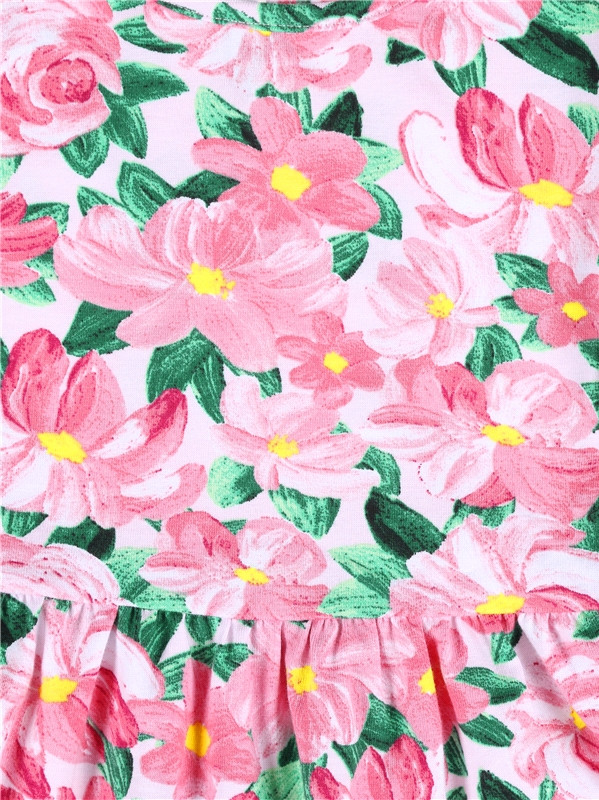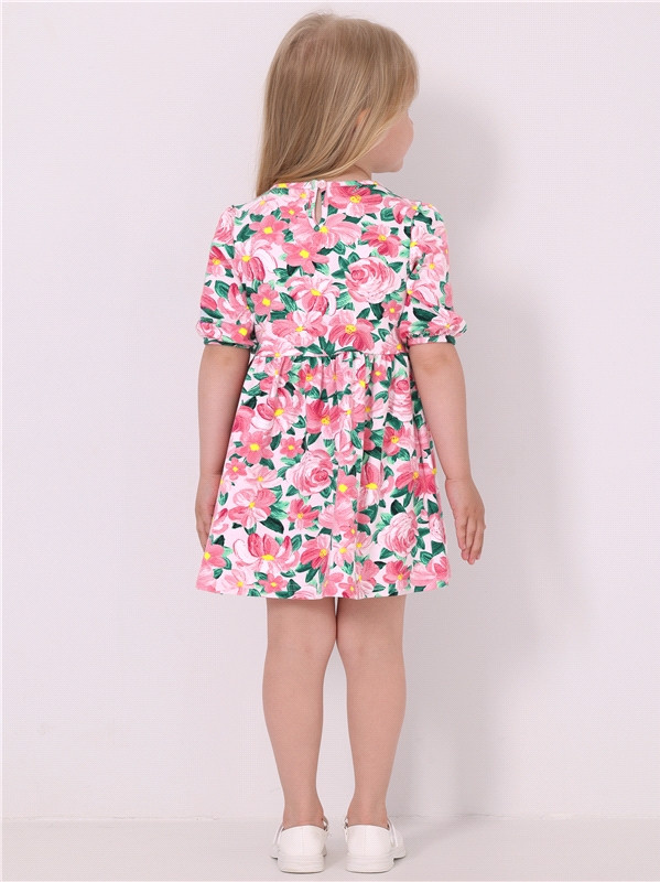 Платье для девочки выполнено из кулира — легкого хлопкового полотна с лайкрой. Изделие с рукавами-фонариками, собранными по низу на эластичную тесьму, юбочка проспорена по линии талии, застежка на пуговицу по спинке. Отличный выбор для теплого летнего дня!
