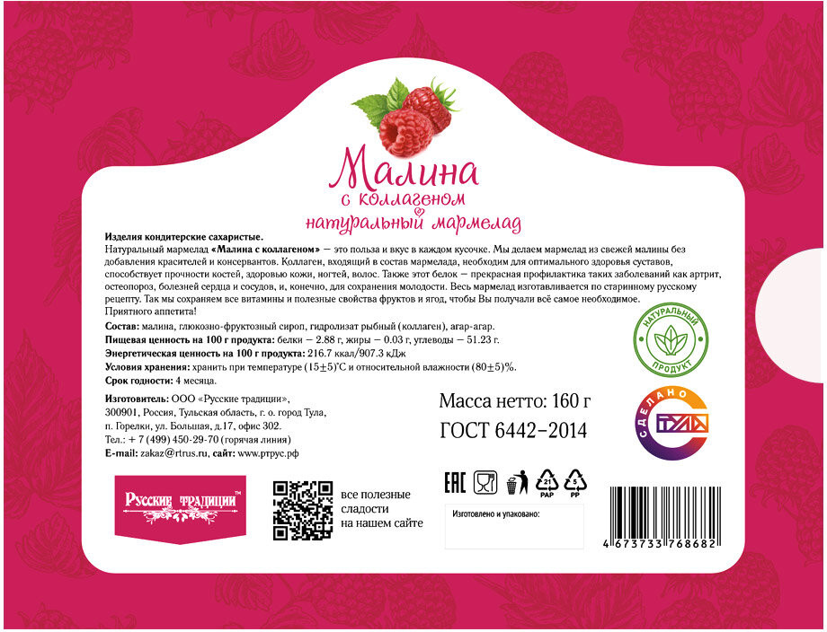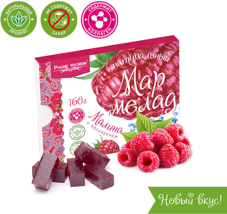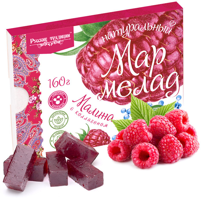 атуральный мармелад «Малина — коллаген» — нежный и ароматный десерт, обладающий сочным вкусом спелой малины. В его состав входят натуральные ингредиенты высокого качества, такие как свежие ягоды малины, сироп глюкозно-фруктозный, коллаген и агар.