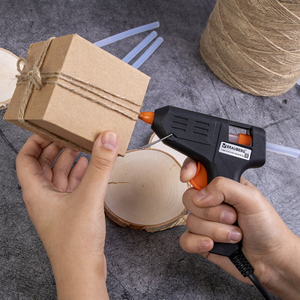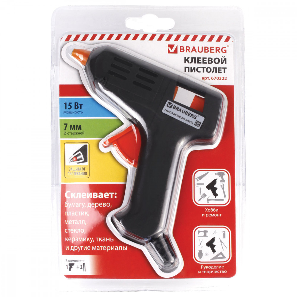 Клеевой пистолет Brauberg предназначен для прочной фиксации поверхностей с помощью расплавленной клеевой массы. Является одним из главных помощников в творчестве для изготовления разнообразных поделок, а также в быту для склеивания мелких деталей. С его помощью можно склеить дерево, пластик, резину, кожу, стекло, металл, ткань, пенопласт, керамику, картон, бумагу, цветы и проч. Заправляется специальным клеевым стержнем диаметром 7 мм. Пистолет клеевой мощностью 15 Вт работает от сети. Производительность 6 г/мин обеспечивает непрерывную подачу клея.