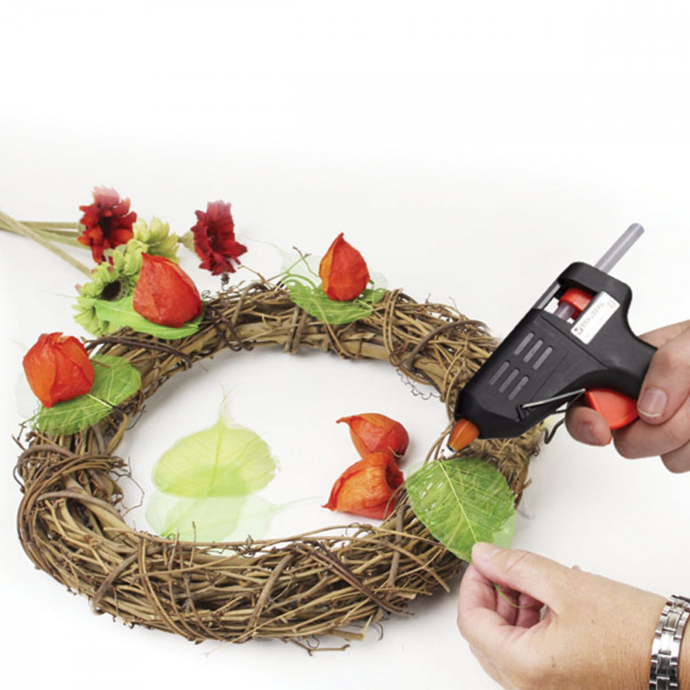 Рабочая температура пистолета: 130-272 °C. 2 клеевых стержня в комплекте. Корпус изготовлен из ударопрочной пластмассы и имеет скобу для надежной установки в нерабочем положении. Используется малый клеевой пистолет в основном в быту, там где нужно что-то подклеить в небольшом объеме, например, для декорирования или изготовления упаковочной и сувенирной продукции. Удобен для работы с малогабаритными изделиями.