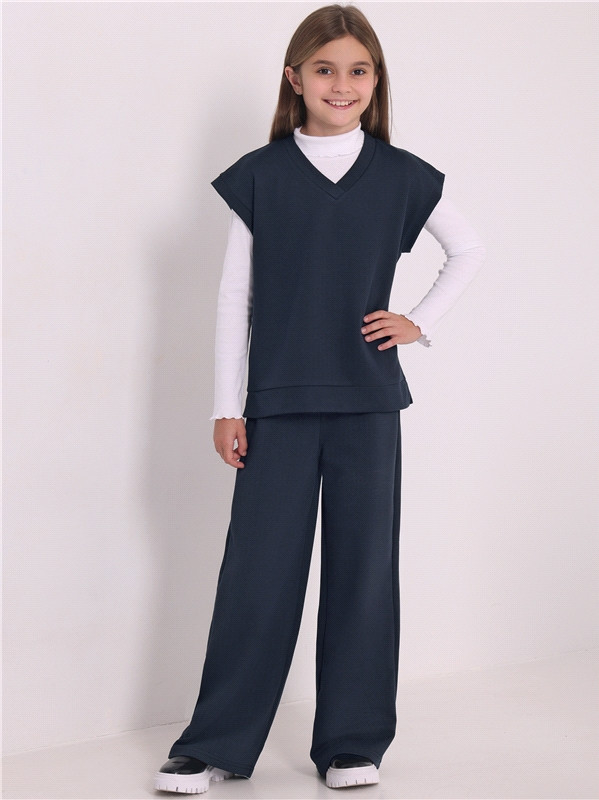 Комплект для девочки из жилета и брюк выполнен из плотного полотна с рельефным рисунком, выполненным с применением жаккардового плетения. Жилет прямого кроя с v-образным вырезом горловины, без карманов и со спущенной линией плеча. Брюки-палаццо без карманов на удобном эластичном поясе. Отличный вариант для школы и не только!
