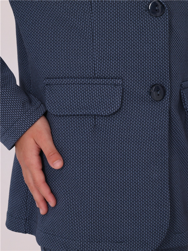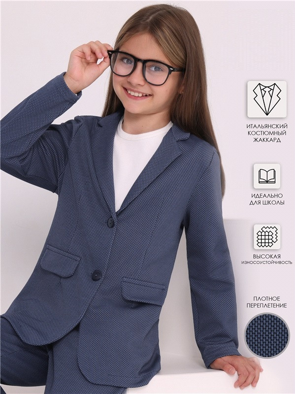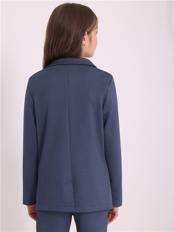 Жакет для девочки из плотного полотна с рельефным рисунком, выполненным с применением жаккардового плетения. Изделие полуприлегающего силуэта с длинными рукавами, с застежкой на пуговицы и шлицей по спинке. Линия талии подчеркнута вытачками. Классический отложной воротник. Отличный вариант для школы!