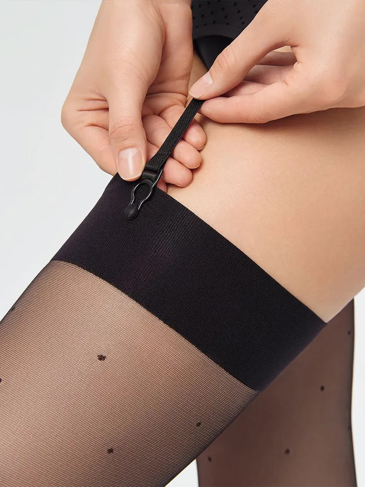 Женские чулки под пояс 20 den, фантазийные, в горошек. Тонкие, эластичные, с гладкой каймой для крепления застежек пояса. Благодаря отсутствию силикона, они идеально подойдут для чувствительной кожи, склонной к появлению аллергии. Широкая кайма комфортно облегает ногу, а невидимый мысок позволяет носить calze Dea Pois с открытой обувью.