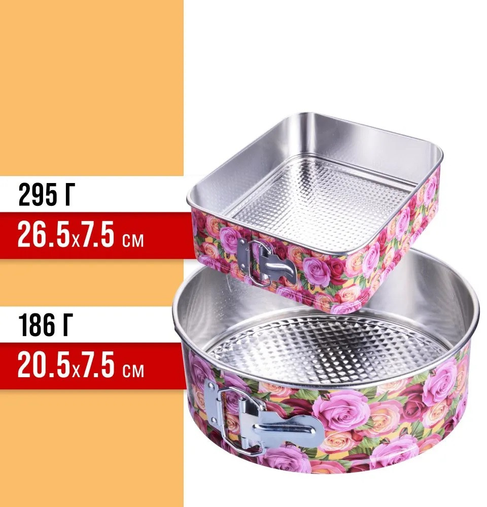 Удобные раздвижные формы для выпечки позволяют быстро испечь торт нужной формы и без особого труда достать выпечку из нее, благодаря разъемной эргономичной конструкции с защелкой. Цветное покрытие обеспечивает защиту от истирания корпуса, а великолепный рисунок с розами будет радовать Вас при каждом ее использовании. Съемная боковая стенка и дно также позволяет легко и быстро помыть форму. Разъемные формы для выпечки подходят для всех видов духовок, электрических, газовых и конвекционных. Раскладная форма сделает процесс приготовления кондитерских изделий Вашим любимым хобби.