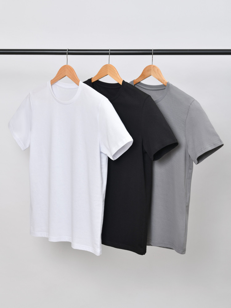 Комплект футболок высого качества.После стирки не садятся,не вытягиваются,не линяют.Ткань эластичная.плотная,очень приятная для телаю