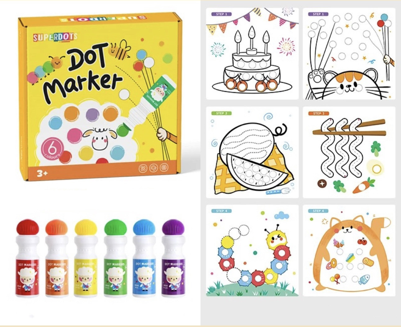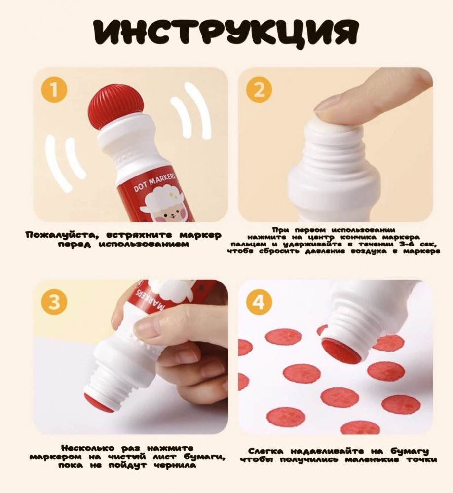Набор точечных маркеровВ данный момент этот товар отсутствует в продаже. Возможно, у нас найдется аналогичный или похожий товар здесь. Точечные маркеры — набор для раннего развития, художественного просвещения и раскрытия таланта художника Вашего ребёнка. 2 способа рисования: точечно, линия. Каждый маркер имеет достаточно большой объем — 60мл. 1 маркер заменяет 36 фломастеров. Краска легко смывается теплой водой. |