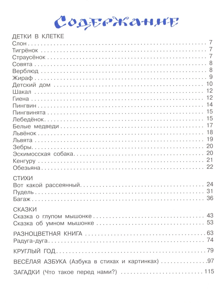 Очень хорошая книга - твердый переплет, приятные, не мелкие рисунки, стихи, знакомые с детства. Здесь есть и цикл стихов "Детки в клетке", "Пудель", "Вот какой рассеянный", "Багаж", сказки о глупом и умном мышонке, "Веселая азбука", загадки, английские и чешские песенки и др. Долго выбирала сыну книгу Маршака и не жалею, что остановилась именно на этой.