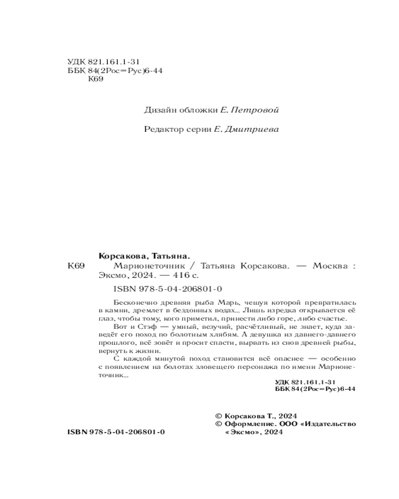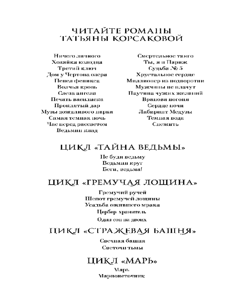 Марионеточникчитается интересная рекомендую В данный момент этот товар отсутствует в продаже. Возможно, у нас найдется аналогичный или похожий товар здесь. Серия: Татьяна Корсакова. Королева мистического романа Бесконечно древняя рыба Марь, чешуя которой превратилась в камни, дремлет в бездонных водах... Лишь изредка открывается её глаз, чтобы тому, кого приметил, принести либо горе, либо счастье. |