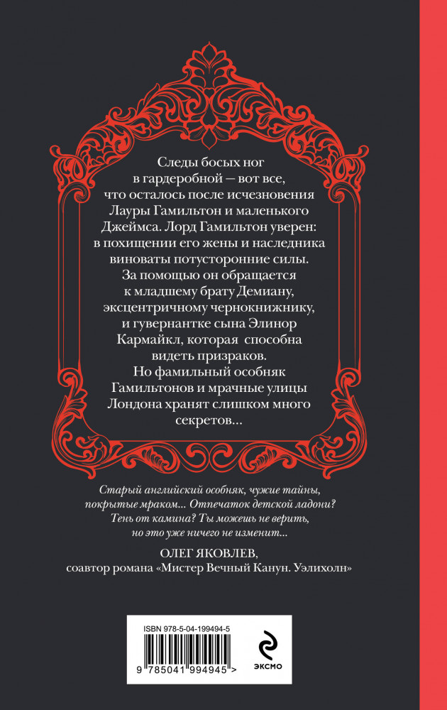 Серия: Призрачный след: новый мистический детектив Следы босых ног в гардеробной — вот всё, что осталось после исчезновения Лауры Гамильтон и маленького Джеймса. Лорд Гамильтон уверен: в похищении его жены и наследника виноваты потусторонние силы. За помощью он обращается к младшему брату Демиану, эксцентричному чернокнижнику и гувернантке сына Элинор Кармайкл, которая способна видеть призраков. Но фамильный особняк Гамильтонов и мрачные улицы Лондона хранят слишком много секретов... |