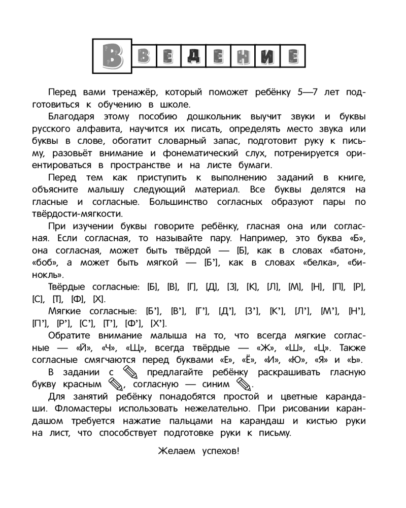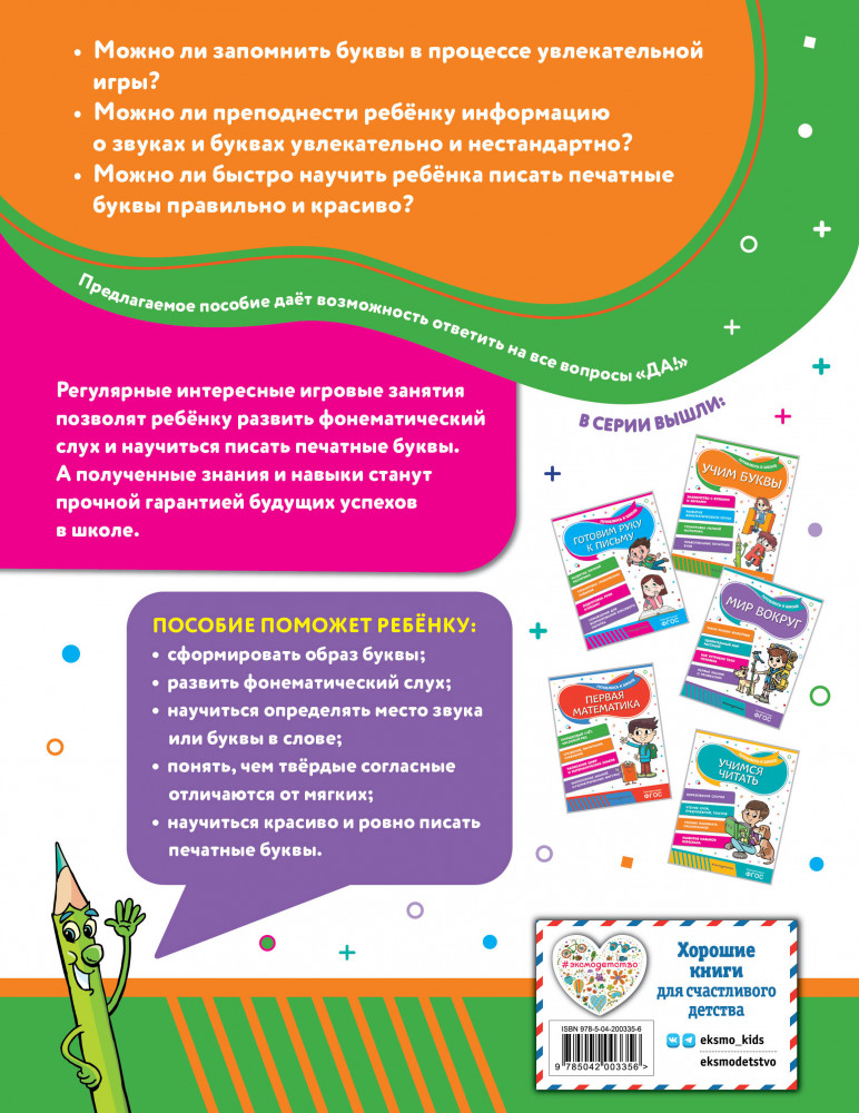 💳 Оплатить за товар можно при получении 🇰🇿 Есть бесплатная доставка по Казахстану от 1 дня 🎁 Копите бонусы с каждой покупки Серия: Готовлюсь к школе Подготовка к школе должна помочь ребенку созреть интеллектуально для нового этапа жизни. А это заложит основу его дальнейшего роста. С помощью представленных в книге игровых заданий родители и педагоги смогут наиболее эффективно организовать развивающие занятия по подготовке ребенка к будущему обучению. Выполняя увлекательные упражнения, дошкольник сможет развить фонематический слух, подготовит руку к письму, будет определять место звука и буквы в слове, научится писать печатные буквы, обогатит словарный запас, потренируется ориентироваться на листе бумаги. |