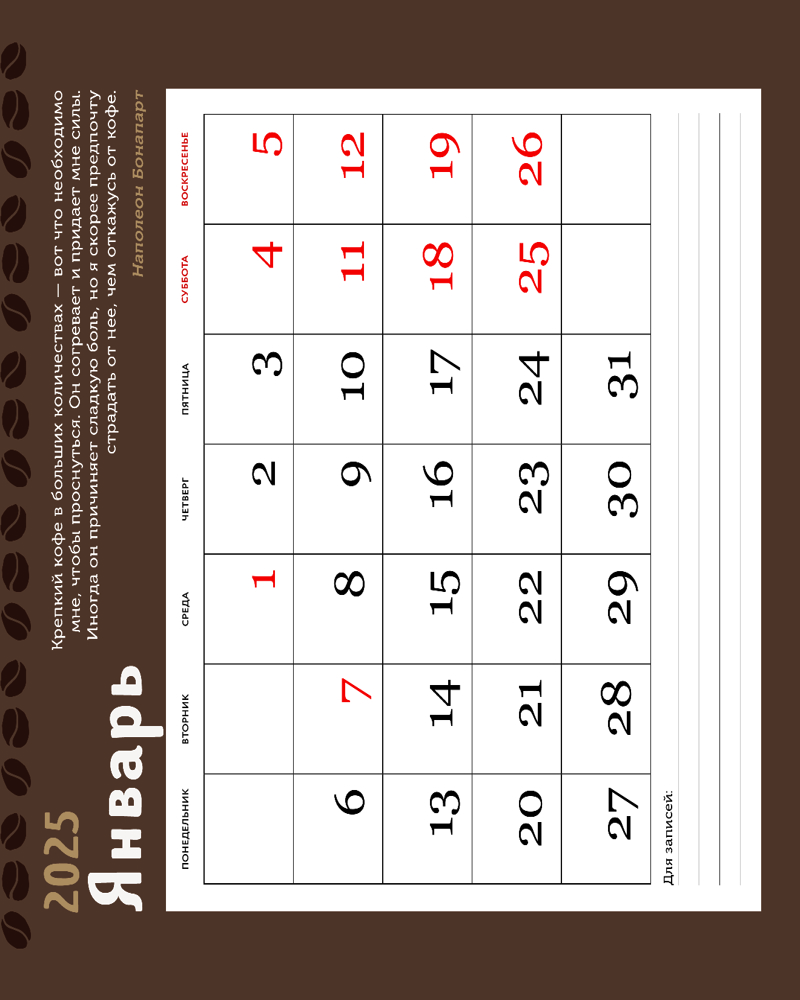 Четвертый год подряд мы выпускаем этот календарь, каждый раз с новыми иллюстрациями, а в данном случае и с новыми цитатами на тему кофе. Атмосферные картинки, мудрые слова и удобная сетка в каждом месяце помогут прожить ваш год с удобством и приятным настроением.