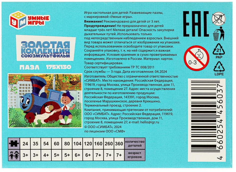 Классические пазлы в коробке «Золотая коллекция «Союзмультфильм». Паровозик из Ромашкова» ТМ «Умные игры» непременно понравятся детям: