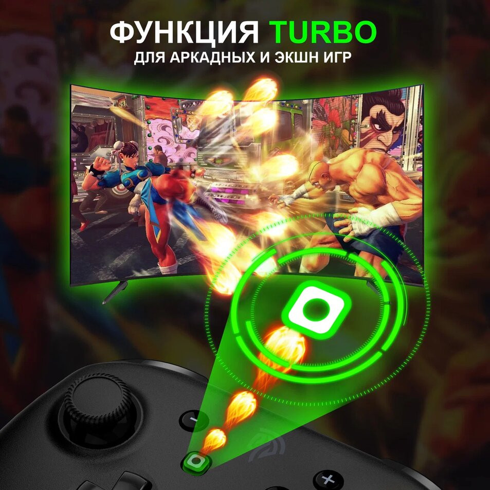 Функция TURBO и встроенный чувствительный шестиосевой гироскопический датчик, установленный для определения углов наклона геймпада в пространстве, значительно повысят качество и точность вашего контроля над игрой.