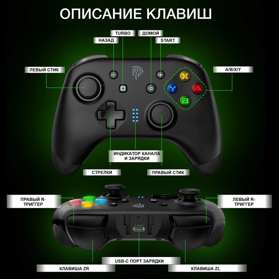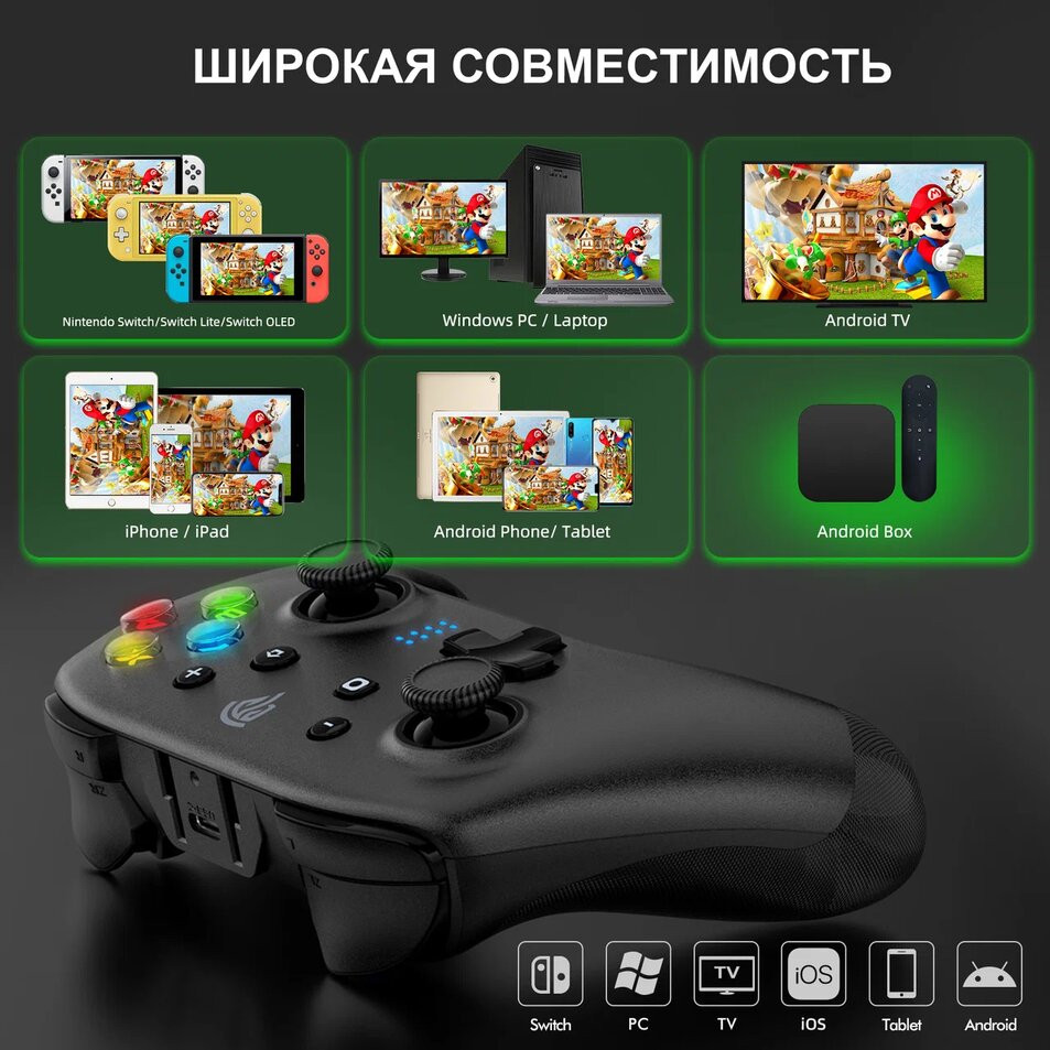 В данный момент этот товар отсутствует в продаже. Возможно, у нас найдется аналогичный или похожий товар здесь. Игровой геймпад с возможностью проводного USB-C подключения или подключения по беспроводной связи Bluetooth 5 к ПК под управлением Windows XP/10/7/8/8.1, смартфону, планшету или ТВ приставкам на Android или iOS, а также к Nintendo Switch, Switch Lite и Switch OLED (по Bluetooth).