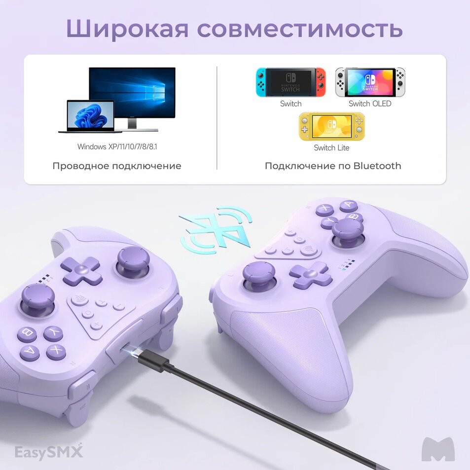 В данный момент этот товар отсутствует в продаже. Возможно, у нас найдется аналогичный или похожий товар здесь. Игровой геймпад с возможностью проводного USB-C подключения к ПК или подключения по беспроводной связи Bluetooth к Nintendo Switch, Switch Lite, Switch OLED. Через Bluetooth можно подключиться Switch, Switch Lite, Switch OLED, а по проводу можно подключить к компьютеру. Наслаждайтесь плавным игровым процессом езависимо от того, на какой платформе вы находитесь. Удобно лежит в руке. Продуманная нескользящая рукоятка надежно удерживает контроль во время интенсивных игр. Избегайте потения для более удобного захвата в течение длительного времени игры.